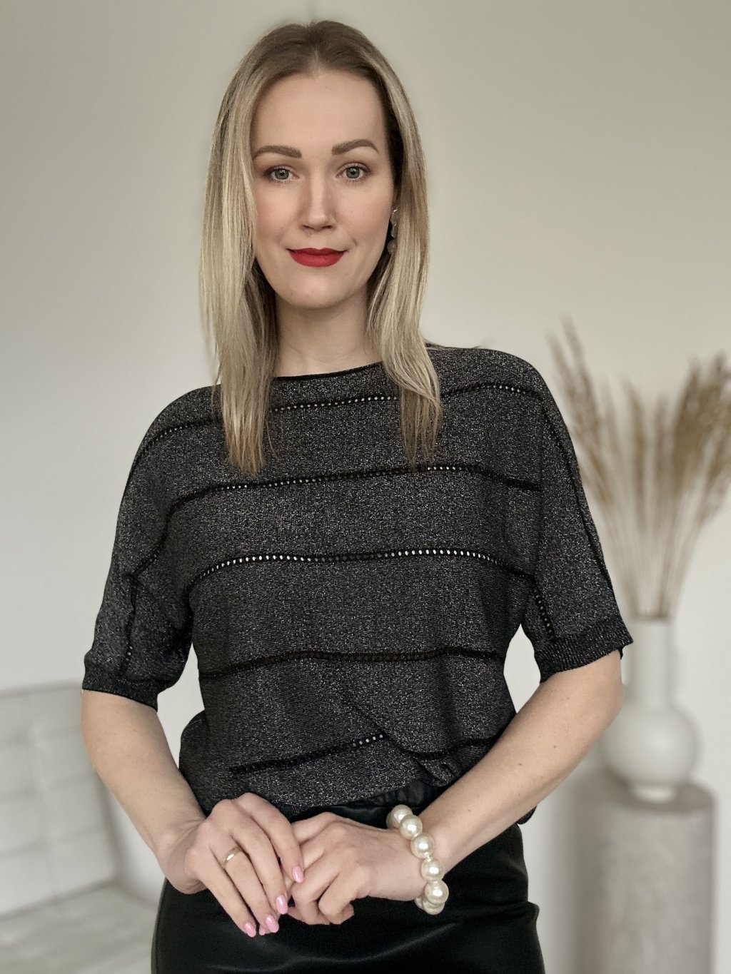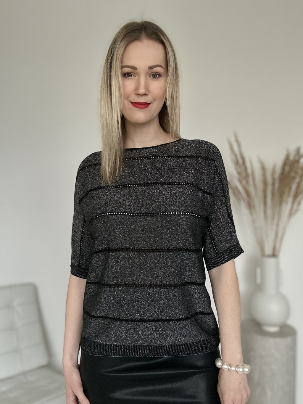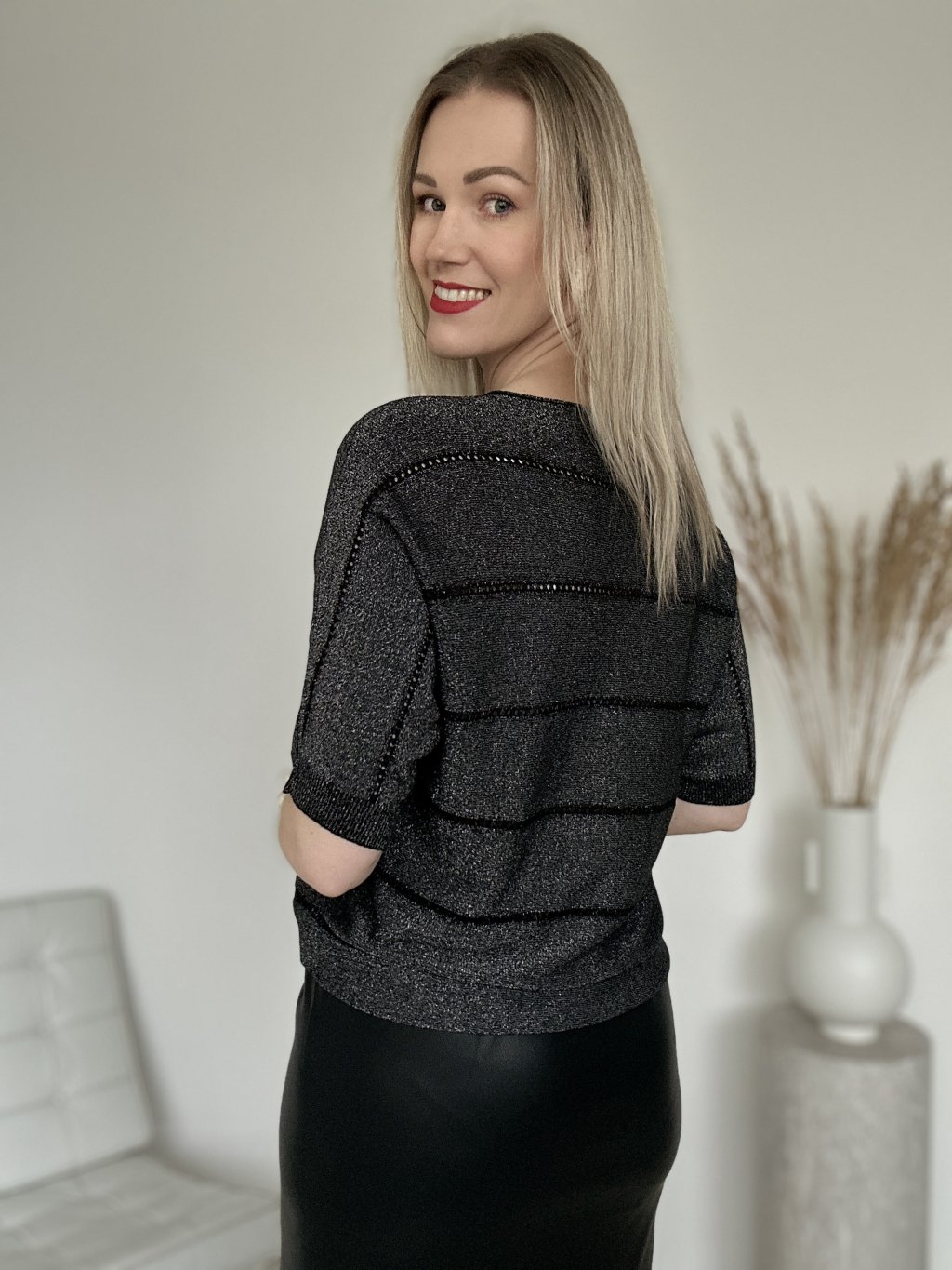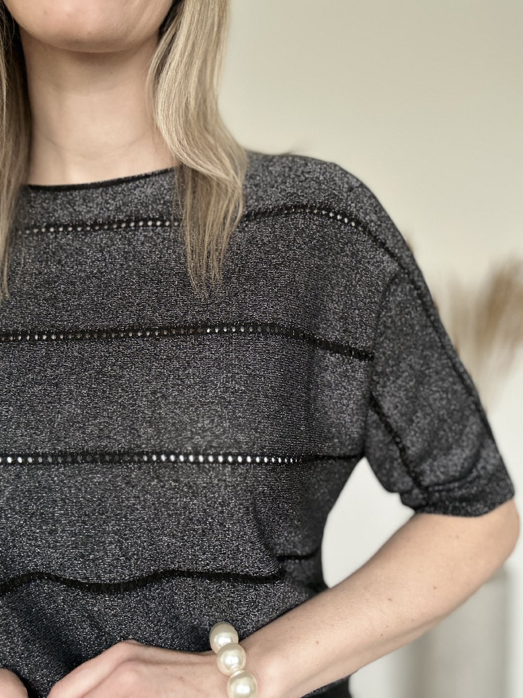 Čierny nadčasový top s krátkymi rukávmi a jemným dierkovaným vzorom vytvárajúcim horizontálne pásy. Má svetložltú farbu s miernym leskom, čo naznačuje prítomnosť metalických nití alebo špecifickej zmesi priadze.