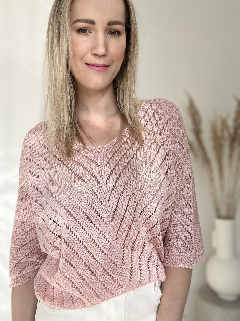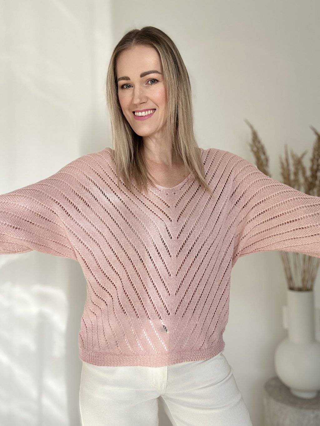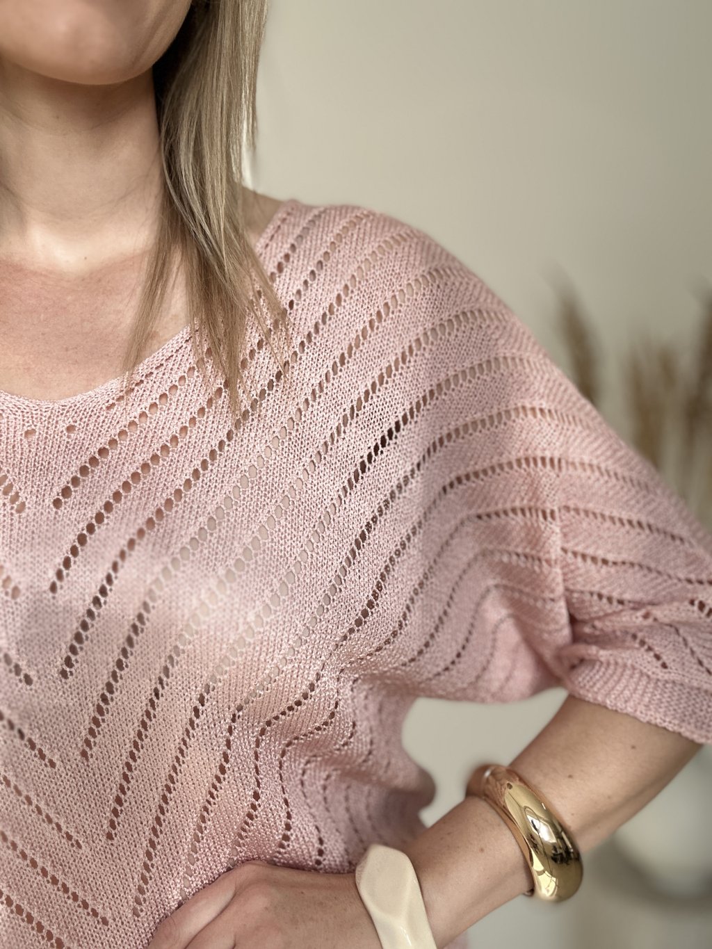 Dámsky top je pletený svetrík (pulóver) v jemnom pudrovoružovom odtieni, ktorý kombinuje romantický vzhľad s ležérnym strihom.