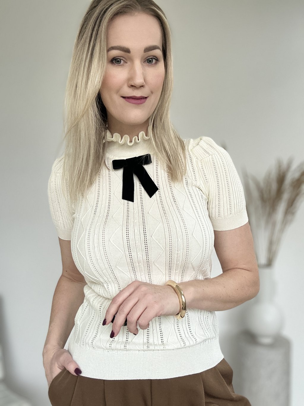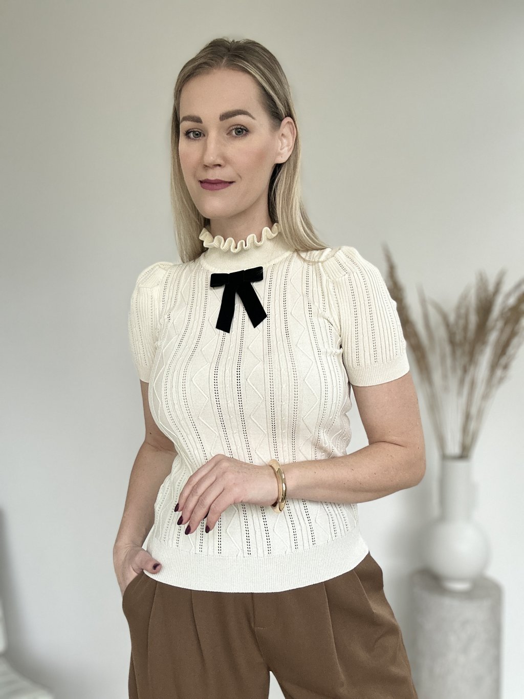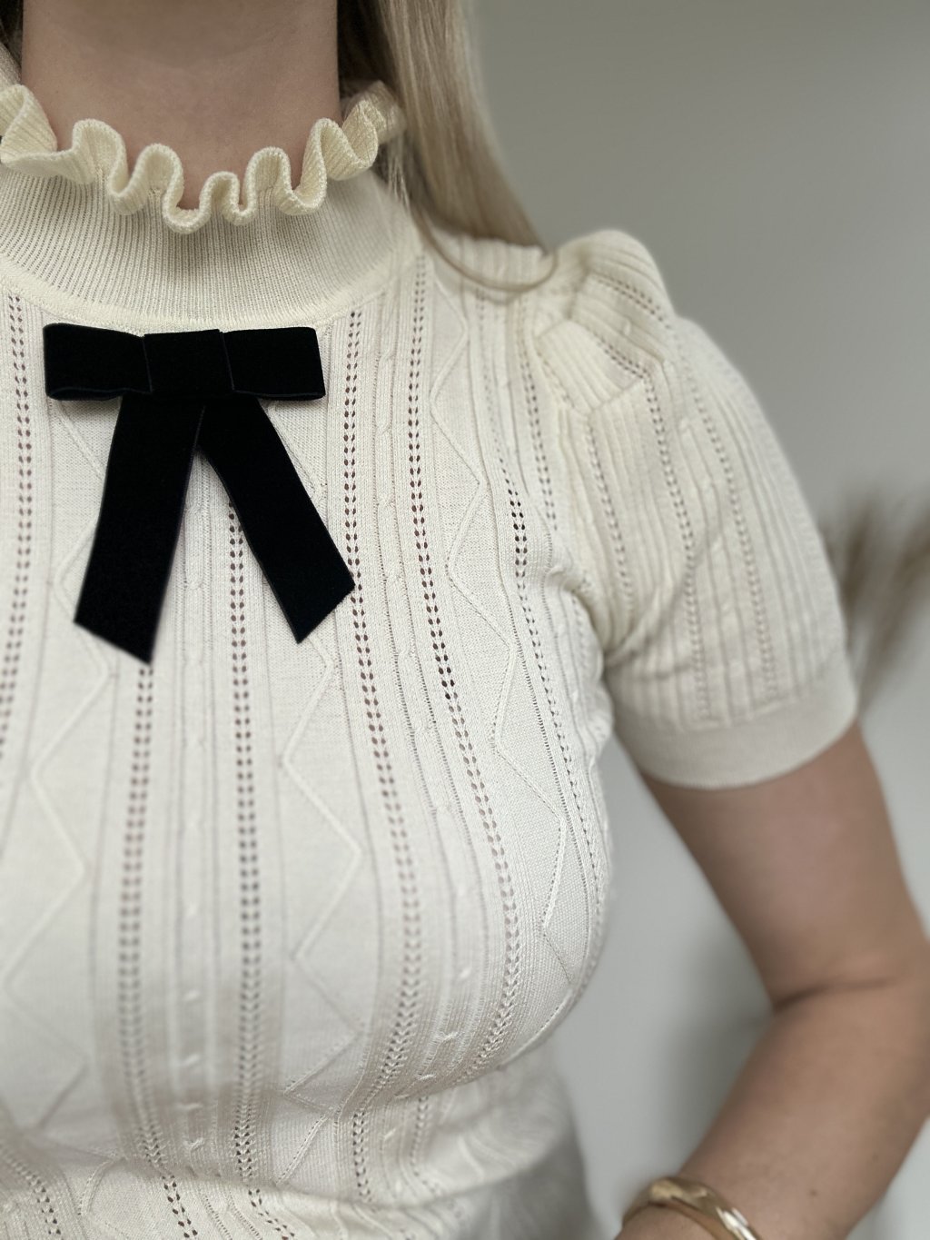 Maslový ažúrový top s mašľou, jemný úplet s vertikálnym rebrovaním a dierkovaným vzorom. Dominantným prvkom je biela mašľa umiestnená pod krkom.