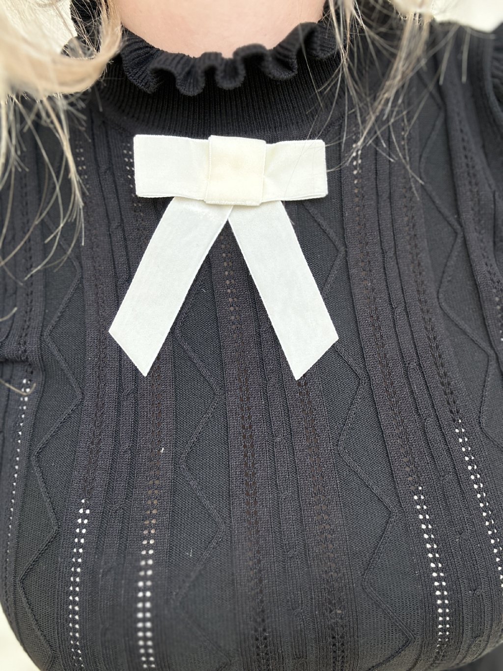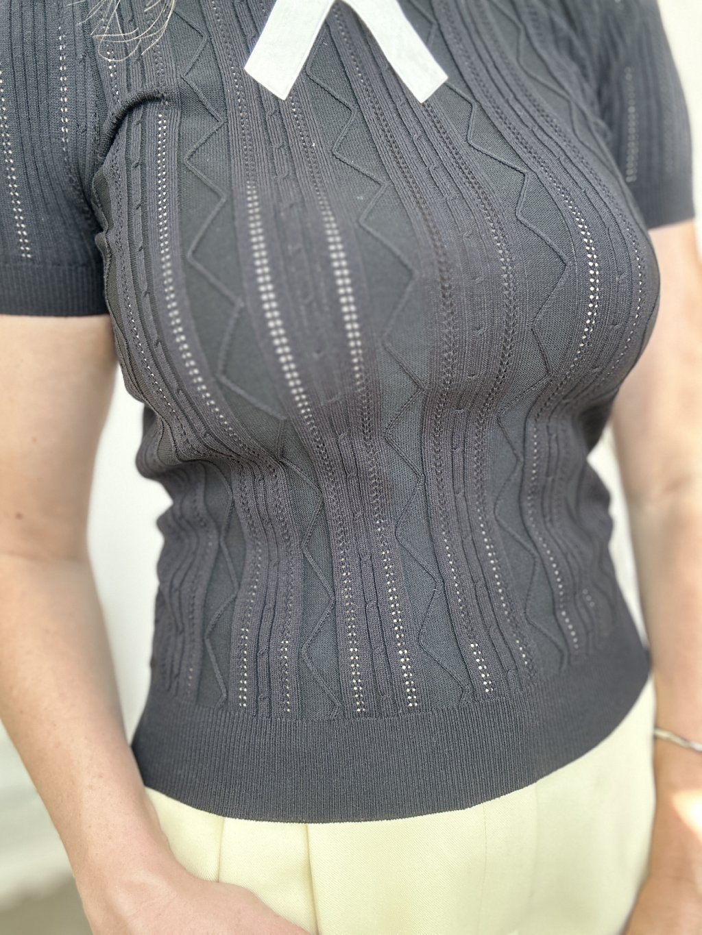 Čierny ažúrový top s mašľou, jemný úplet s vertikálnym rebrovaním a dierkovaným vzorom.