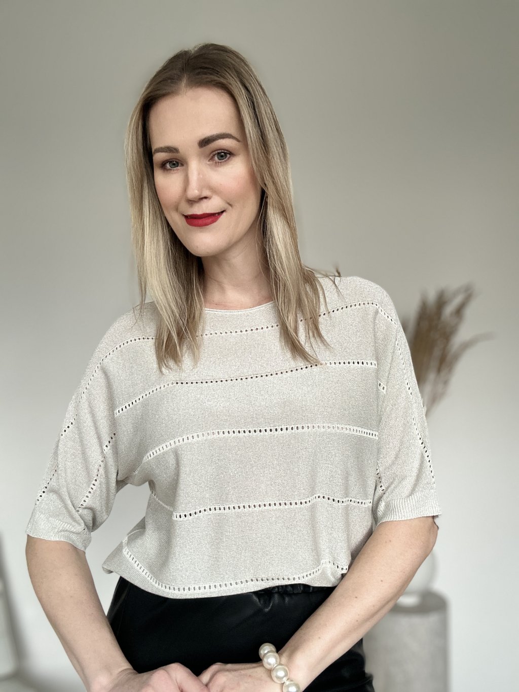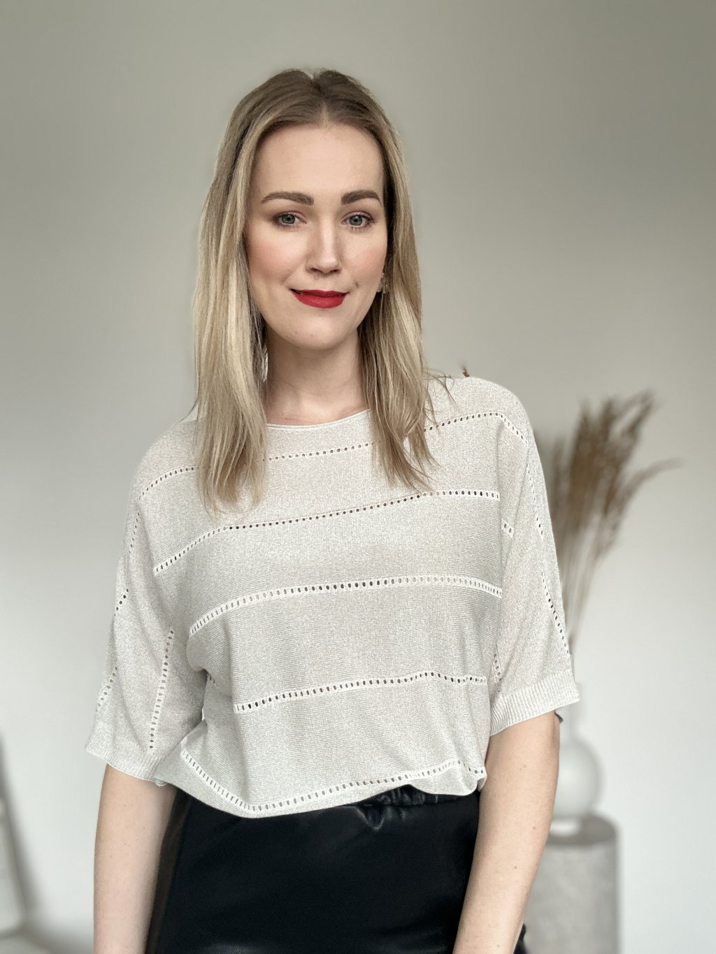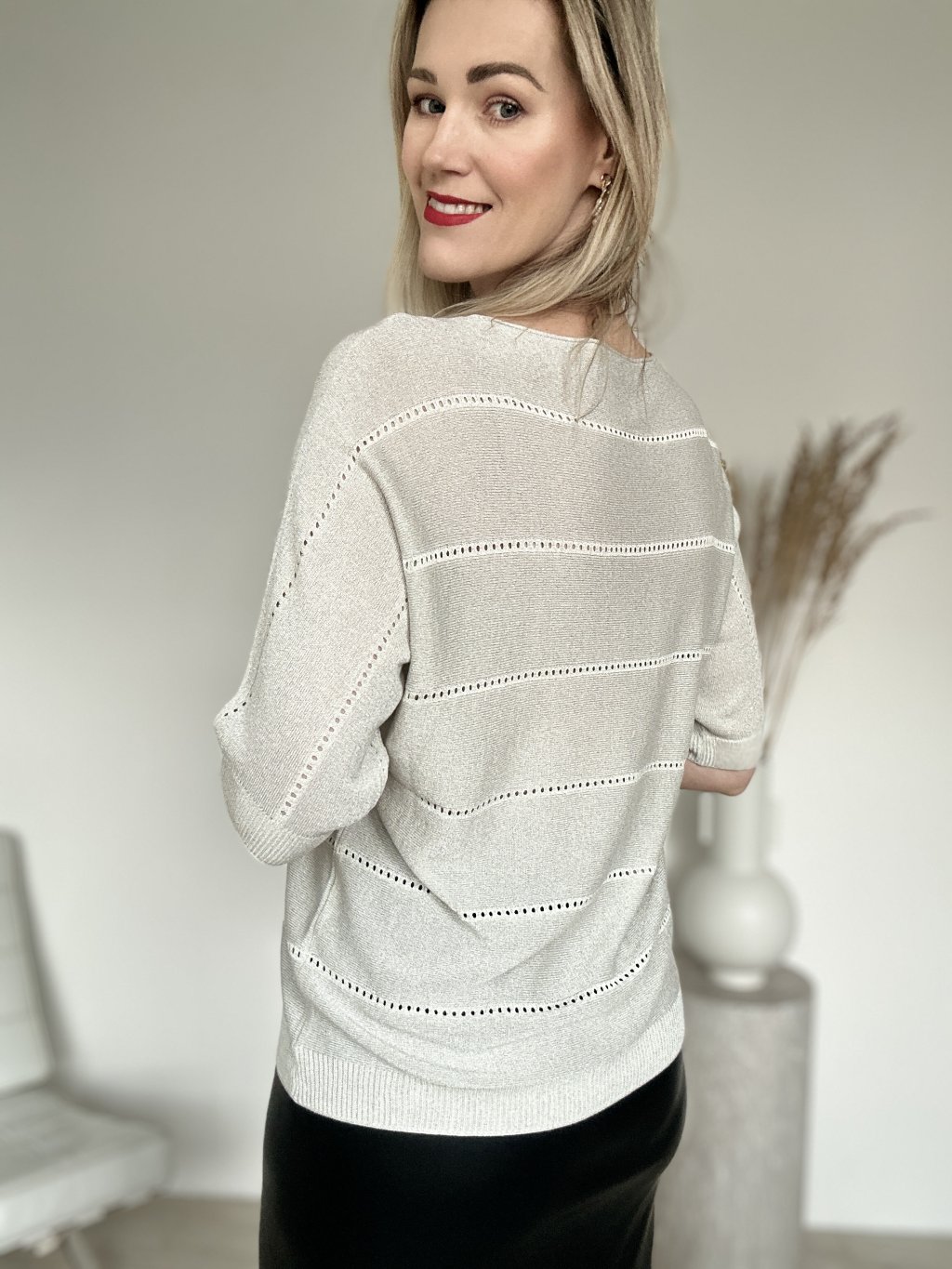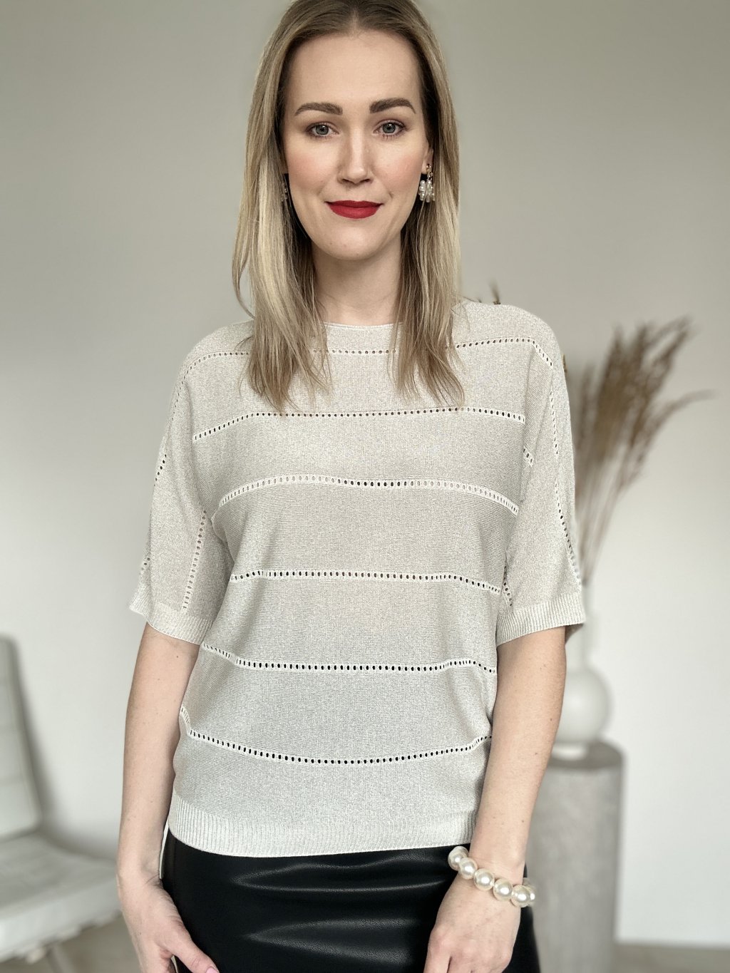 Strieborný nadčasový top s krátkymi rukávmi a jemným dierkovaným vzorom vytvárajúcim horizontálne pásy. Má striebornú farbu s miernym leskom, čo naznačuje prítomnosť metalických nití alebo špecifickej zmesi priadze.