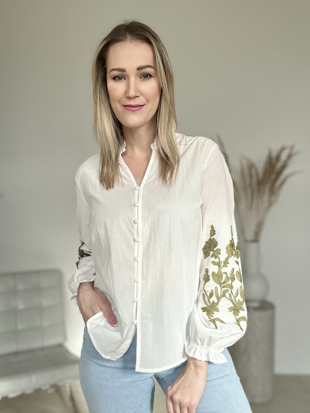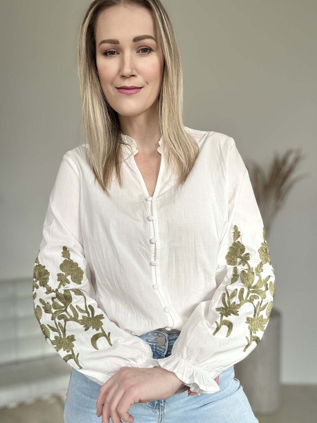 Štýlová biela bavlnená blúzka s výraznou zelenou výšivkou na rukávoch. Dominantným prvkom je kvetinová výšivka v zelenom odtieni, ktorá sa tiahne pozdĺž rukávov.