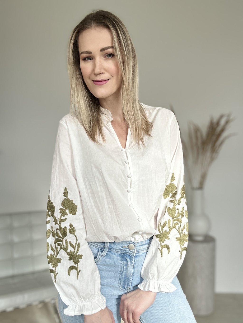 - Štýlová biela bavlnená blúzka s výraznou zelenou výšivkou na rukávoch. Dominantným prvkom je kvetinová výšivka v zelenom odtieni, ktorá sa tiahne pozdĺž rukávov. Popis: Blúzka má dlhé balónové rukávy zakončené elastickými manžetami s volánikom, výstrih do „V“ a zapínanie na gombíky potiahnuté látkou. Dominantným prvkom je kvetinová výšivka v bordovom odtieni, ktorá sa tiahne pozdĺž rukávov.