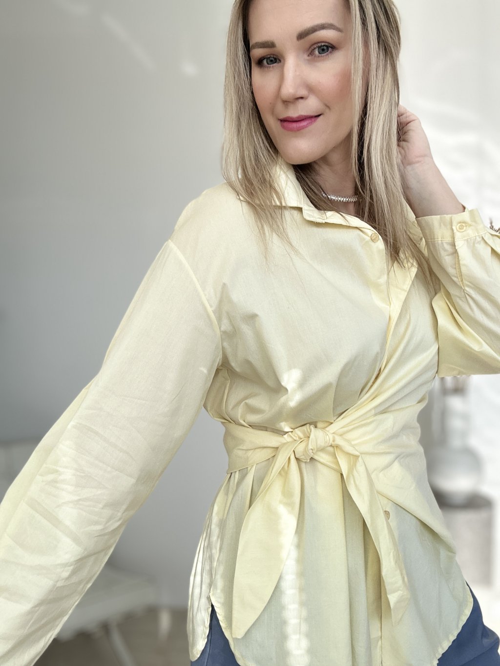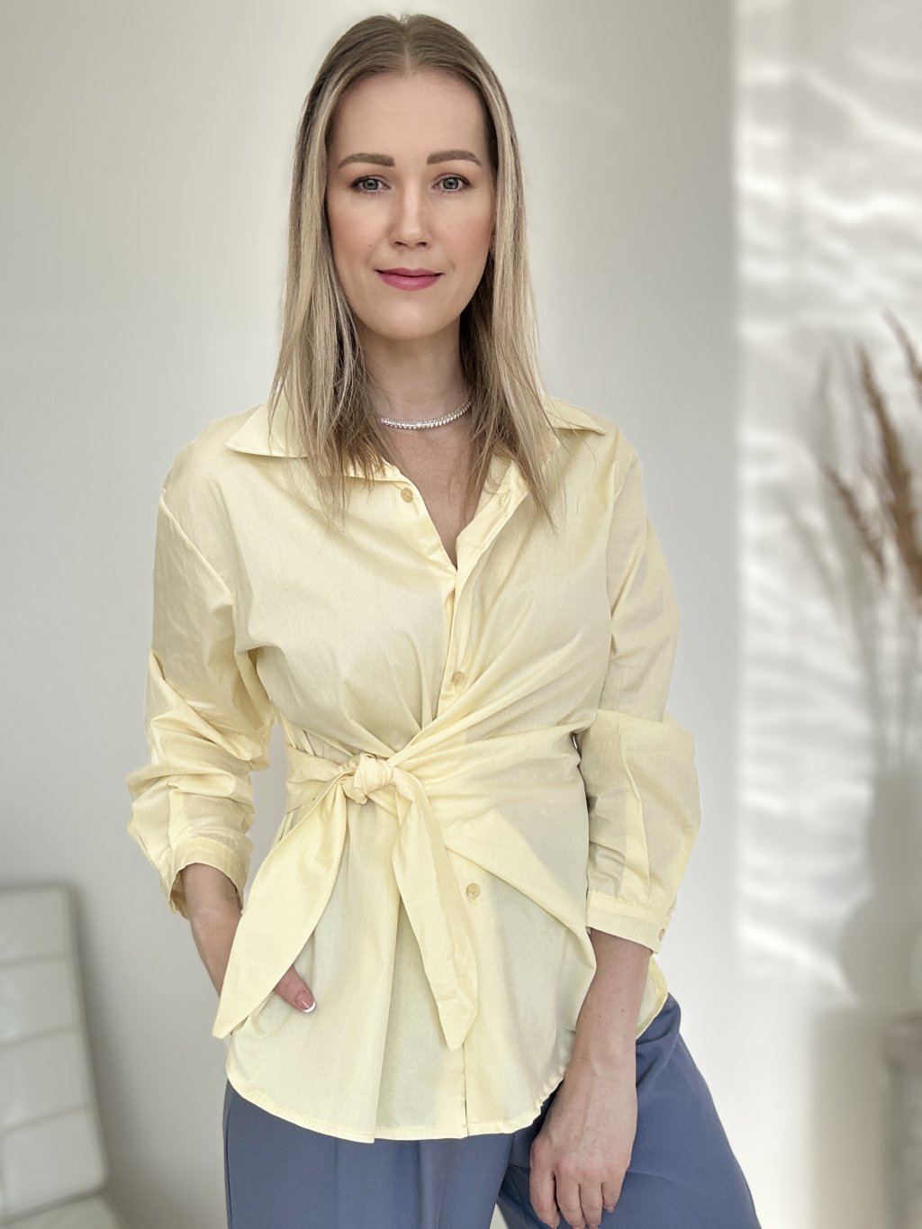 Štýlová žltá košeľa s viazaním v páse, ktorá kombinuje klasický dizajn s moderným detailom.