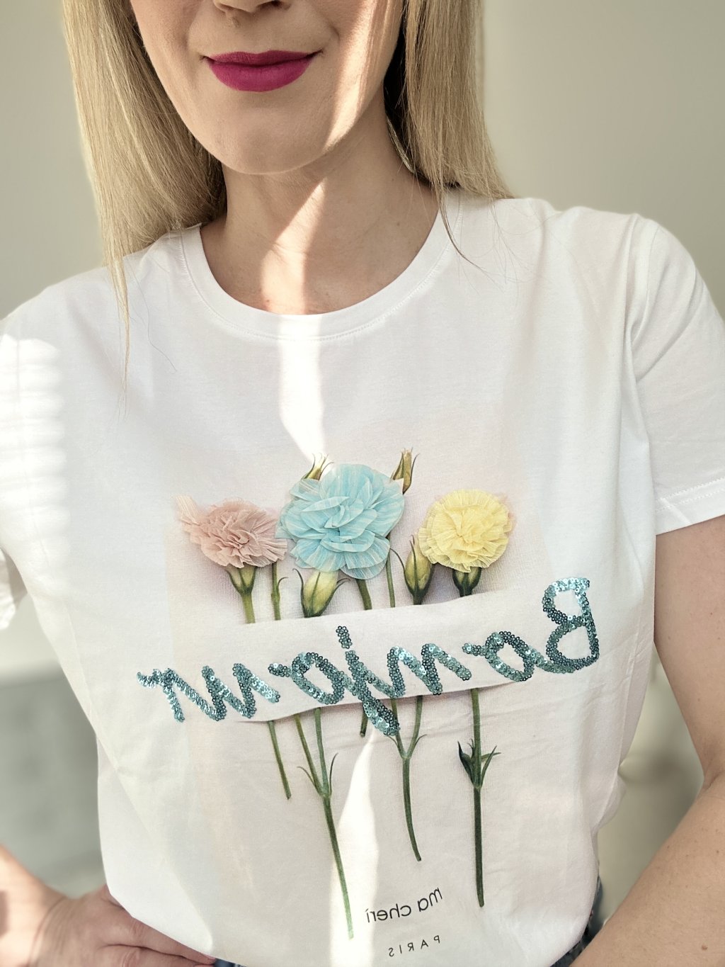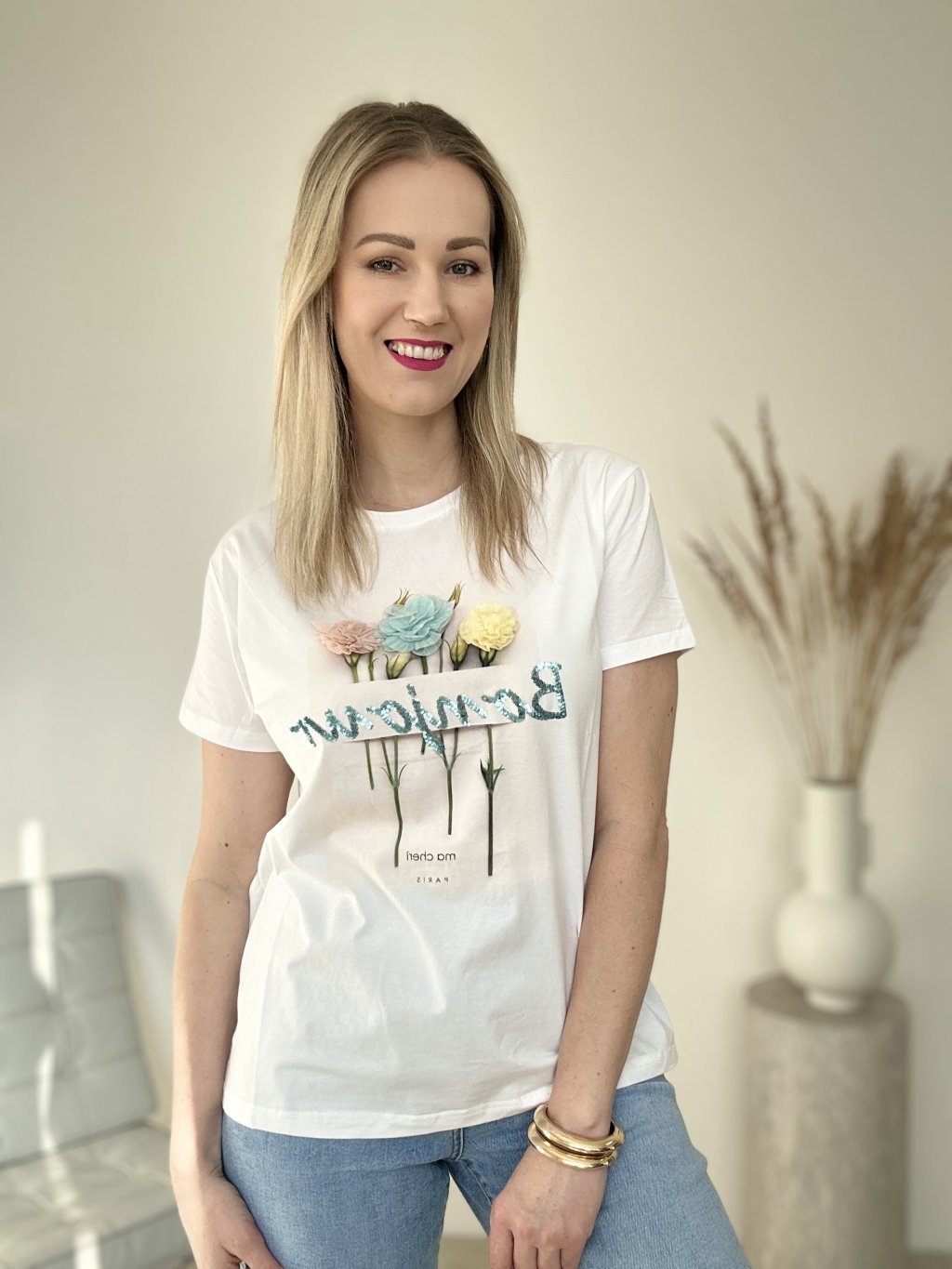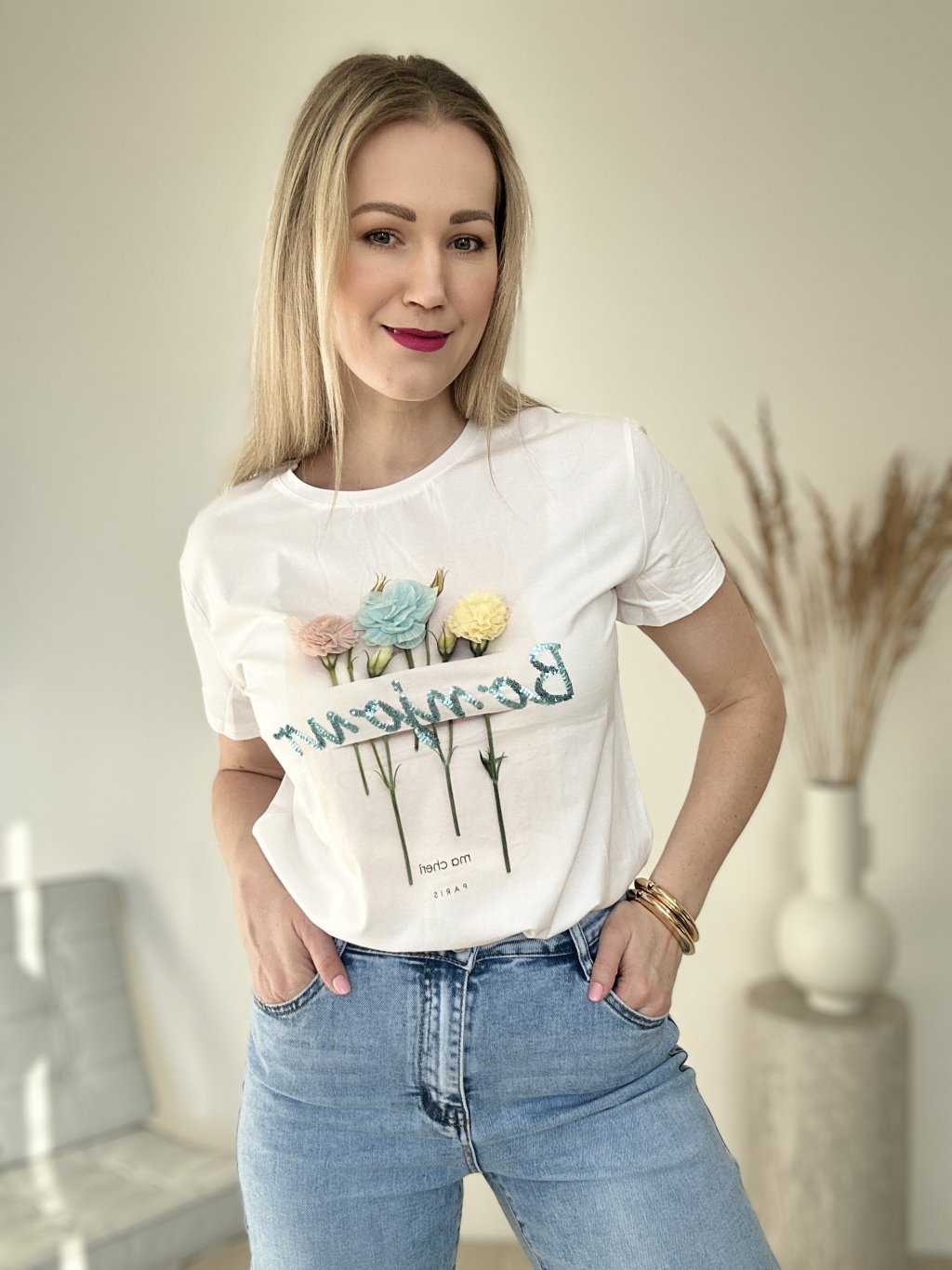 Biele bavlnené tričko as 3D aplikáciou látkových kvetov a nápisom s modrozelenými flitrami.
