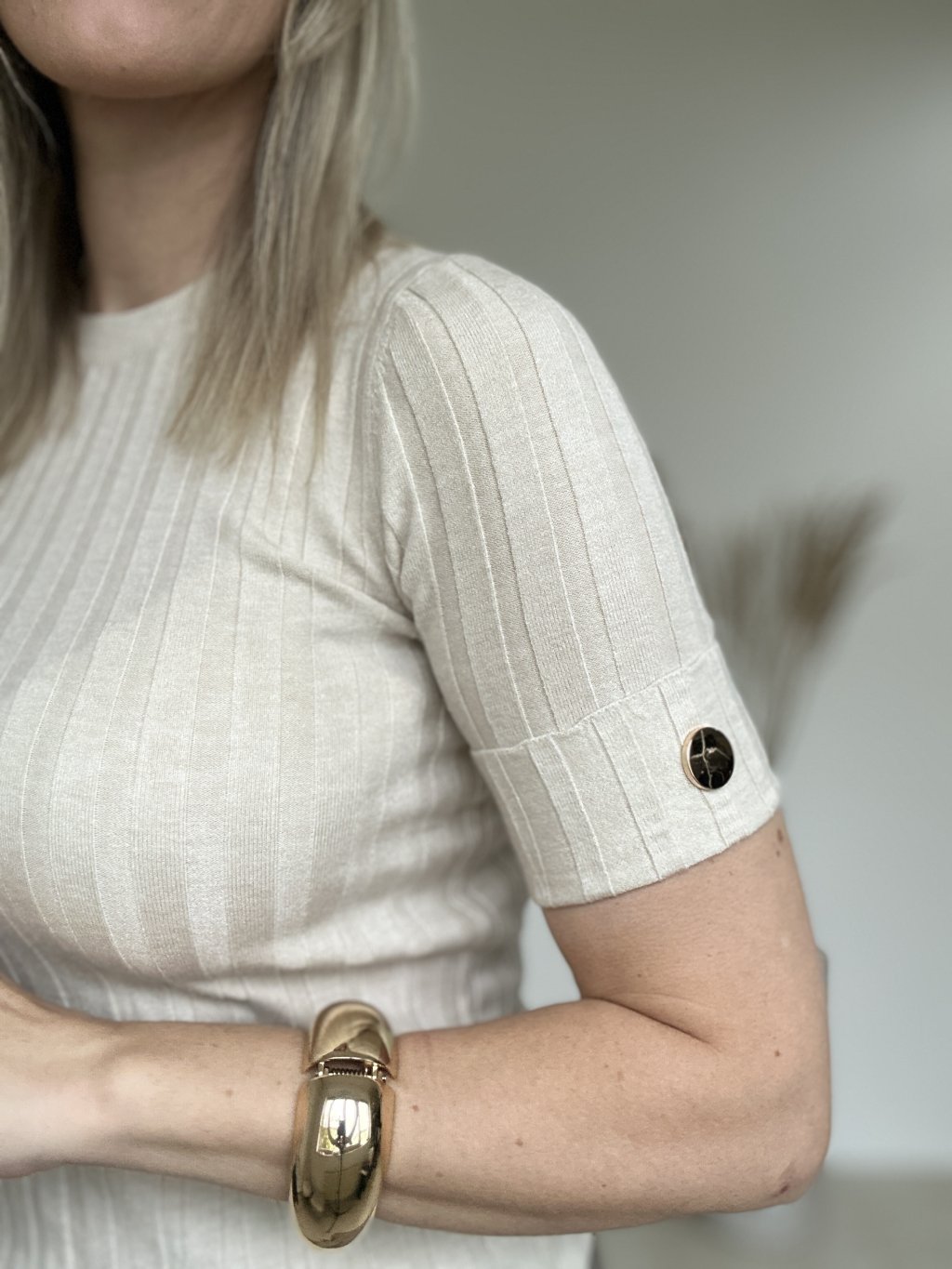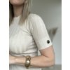 Jednoduchý tenší úpletový rebrovaný top s krátkym rukávom a ozdobným zlatým cvokom.