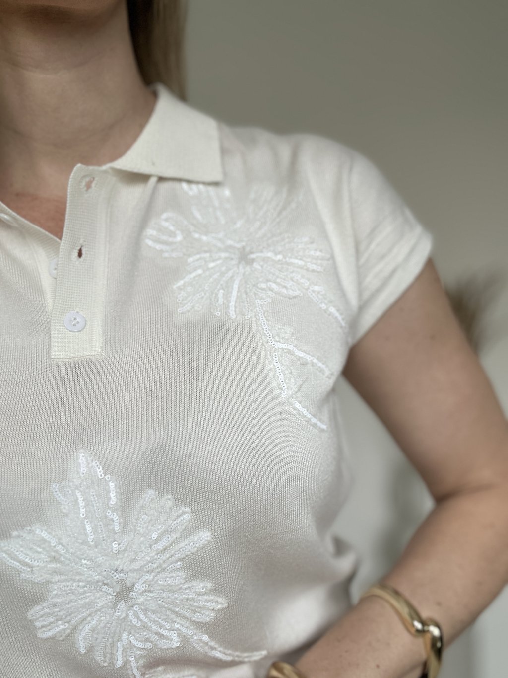 Elegantná dámska polokošeľa z jemného úpletu v krémovom (off-white) odtieni. Tento kúsok spája športovú klasiku s dekoratívnymi prvkami. Dominantným prvkom je výrazná kvetinová výšivka na prednej strane a v oblasti ramien. Výšivka je doplnená o jemné priehľadné flitre, ktoré topu dodávajú decentný odlesk pri pohybe .