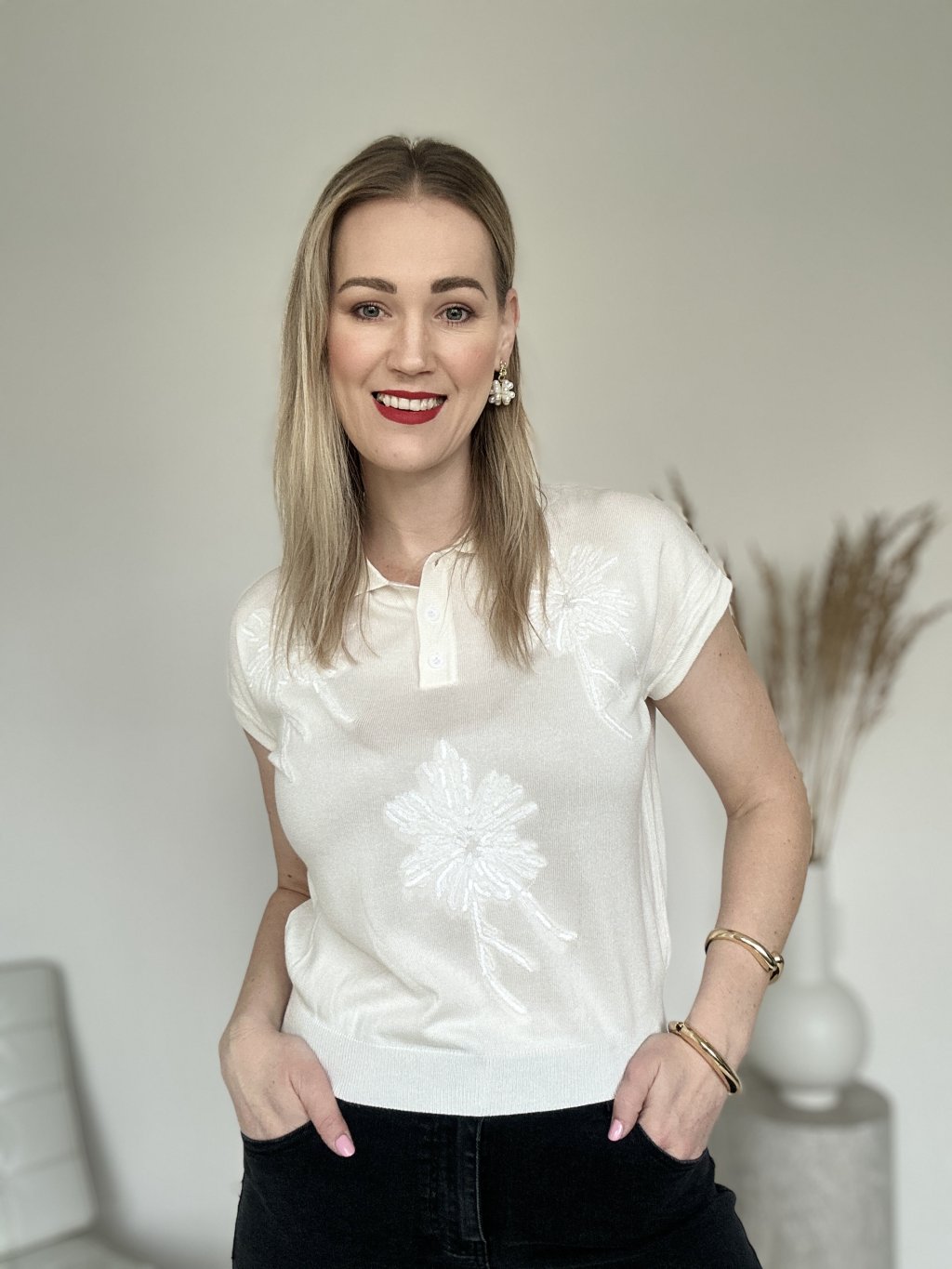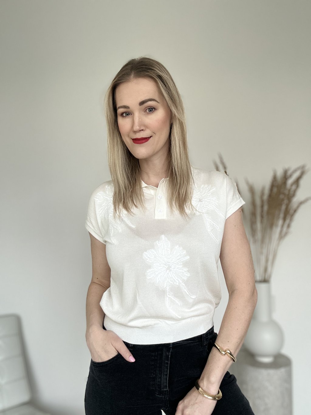 Elegantná dámska polokošeľa z jemného úpletu v krémovom (off-white) odtieni. Tento kúsok spája športovú klasiku s dekoratívnymi prvkami. Dominantným prvkom je výrazná kvetinová výšivka na prednej strane a v oblasti ramien. Výšivka je doplnená o jemné priehľadné flitre, ktoré topu dodávajú decentný odlesk pri pohybe.