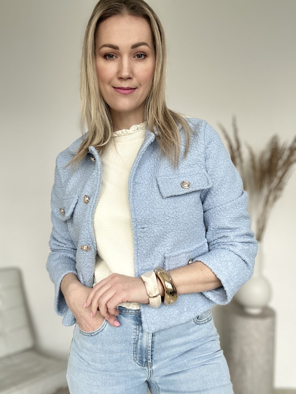 Biely top s dlhým rukávom, riasením v oblasti hrudníka a ozdobnou zlatou sponou. Top je elegantný a vhodný na spoločenské príležitosti, ako sú vianočné večierky.