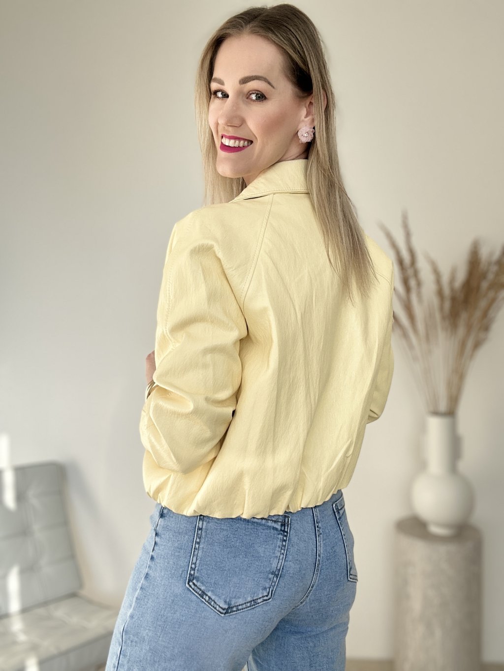 Štýlová prechodná bobmer koženková bunda, má klasický golier a zapínanie na cvoky a v páse sťahujúcu gumičku. Táto bunda je vyrobená z materiálu, ktorý pripomína kožu, čo je obľúbený kúsok ktorý sa hodí do dámskeho šatníka a dá sa nosiť po celý rok.