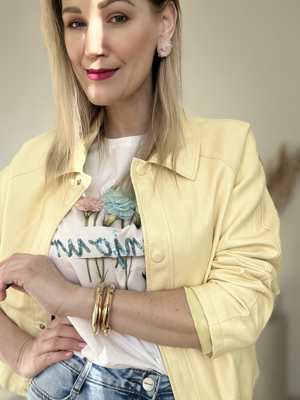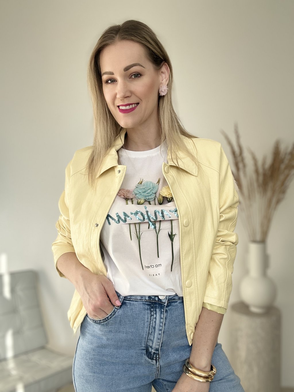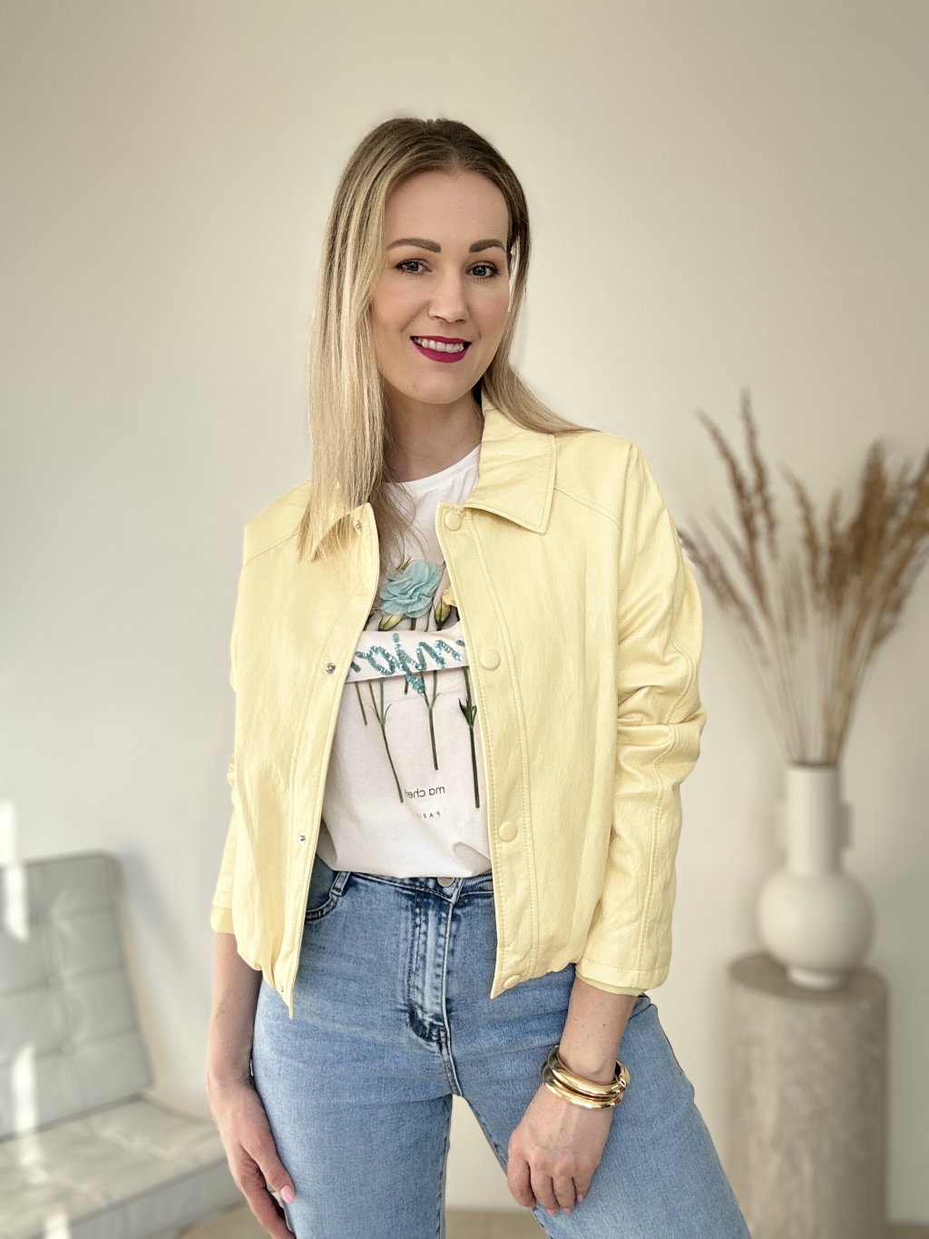 Štýlová prechodná bobmer koženková bunda, má klasický golier a zapínanie na cvoky. Táto bunda je vyrobená z materiálu, ktorý pripomína kožu, čo je obľúbený kúsok ktorý sa hodí do dámskeho šatníka a dá sa nosiť po celý rok.