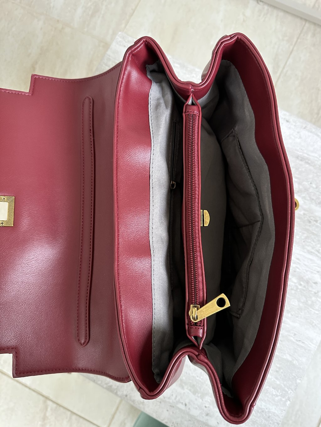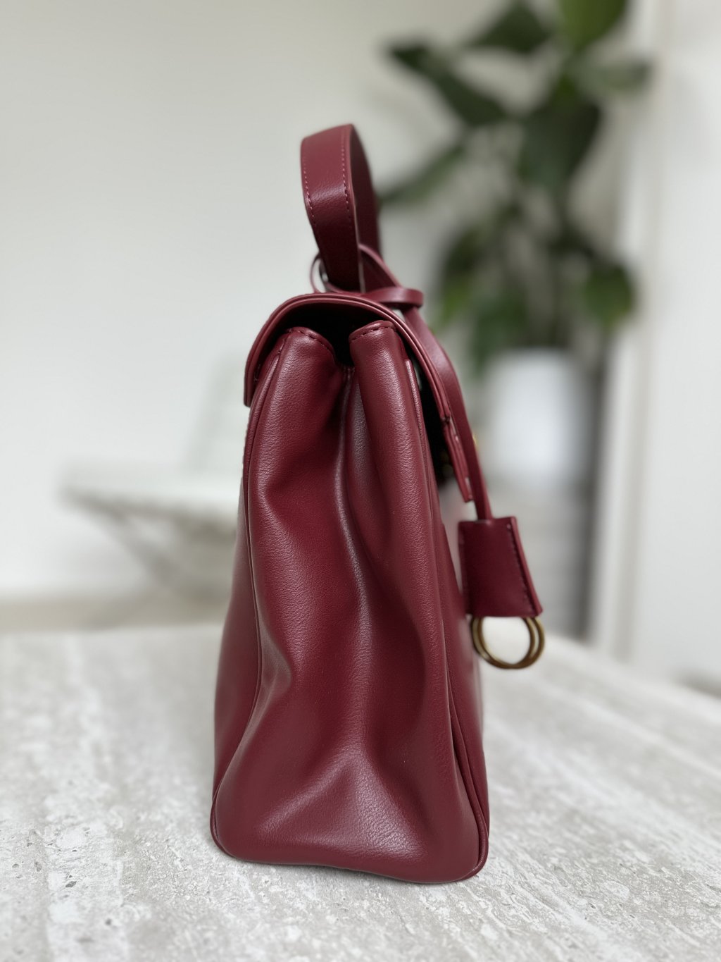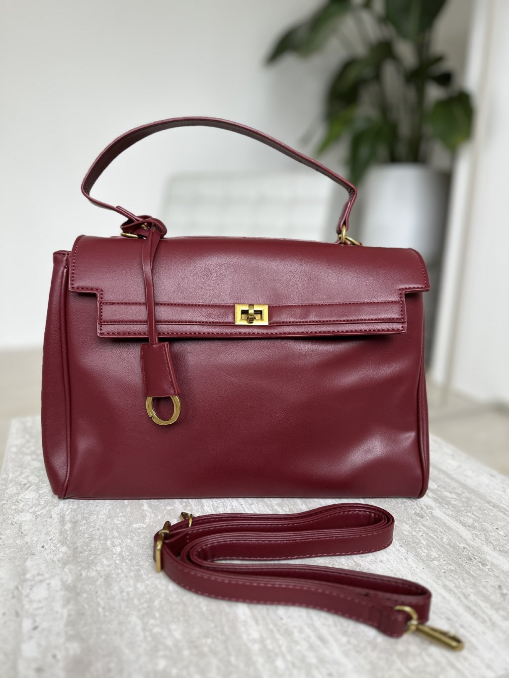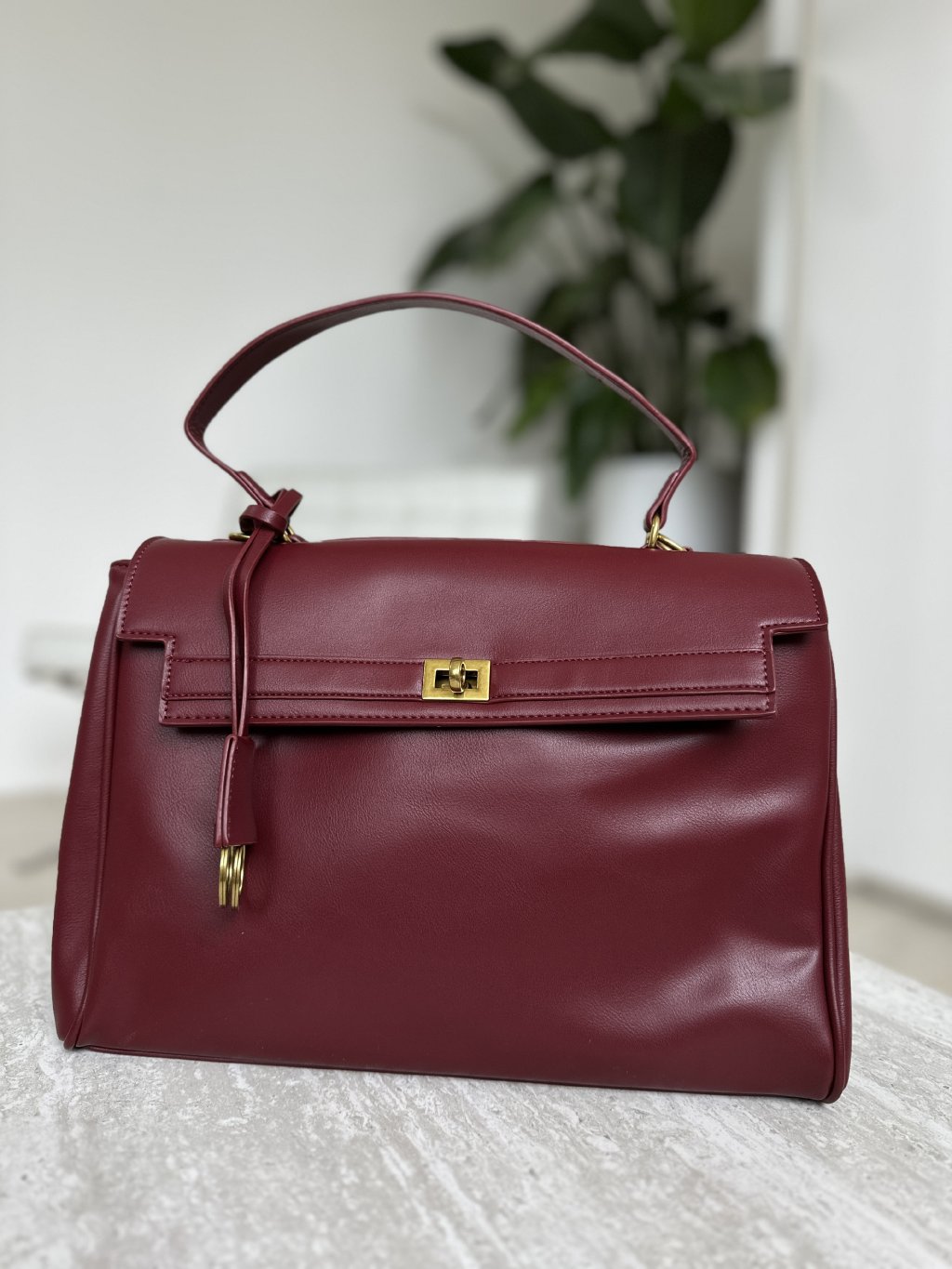 Klasická bordová elegantná kabelka s otočným uzamykacím mechanizmom.