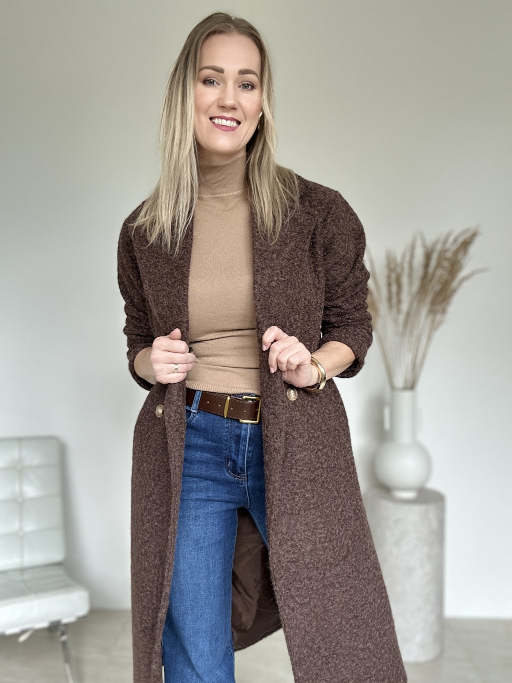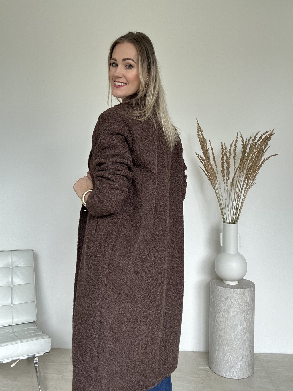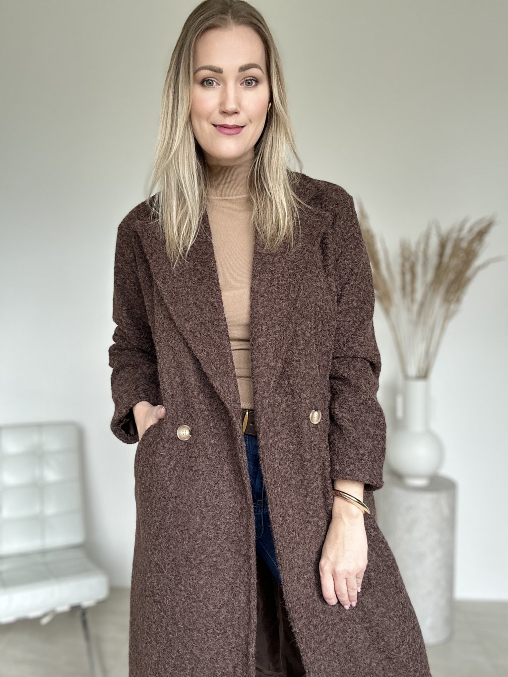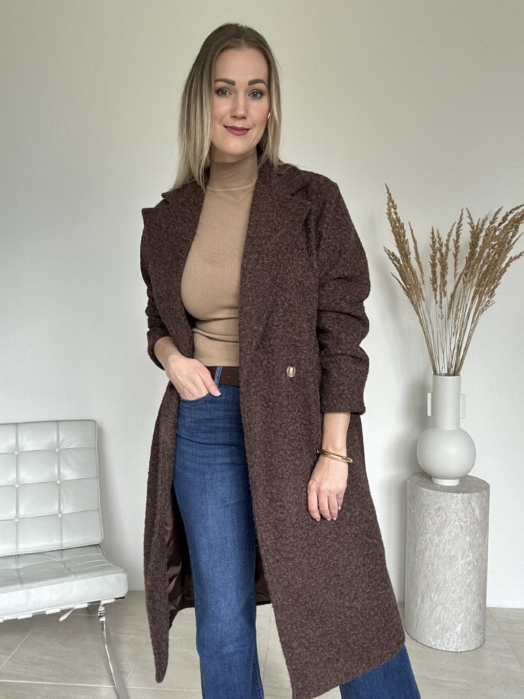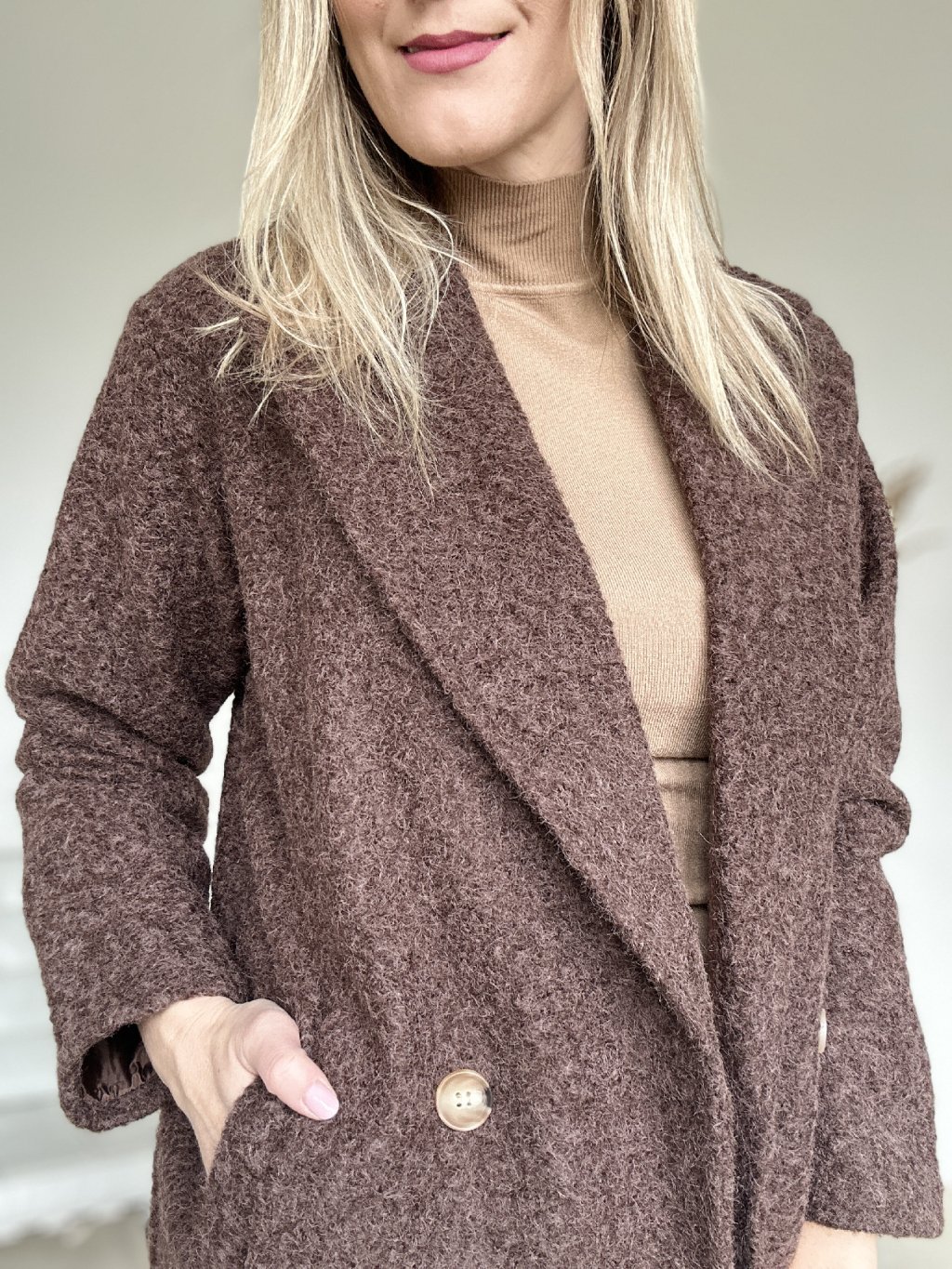 Dlhý bouclé kabát s textúrou ,mierne oversizový, s klopovým golierom a dvojradovým zapínaním na gombíky.