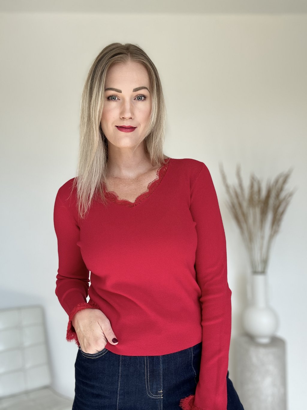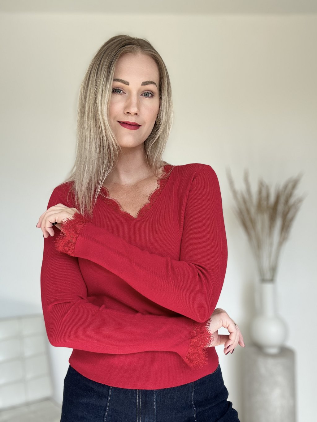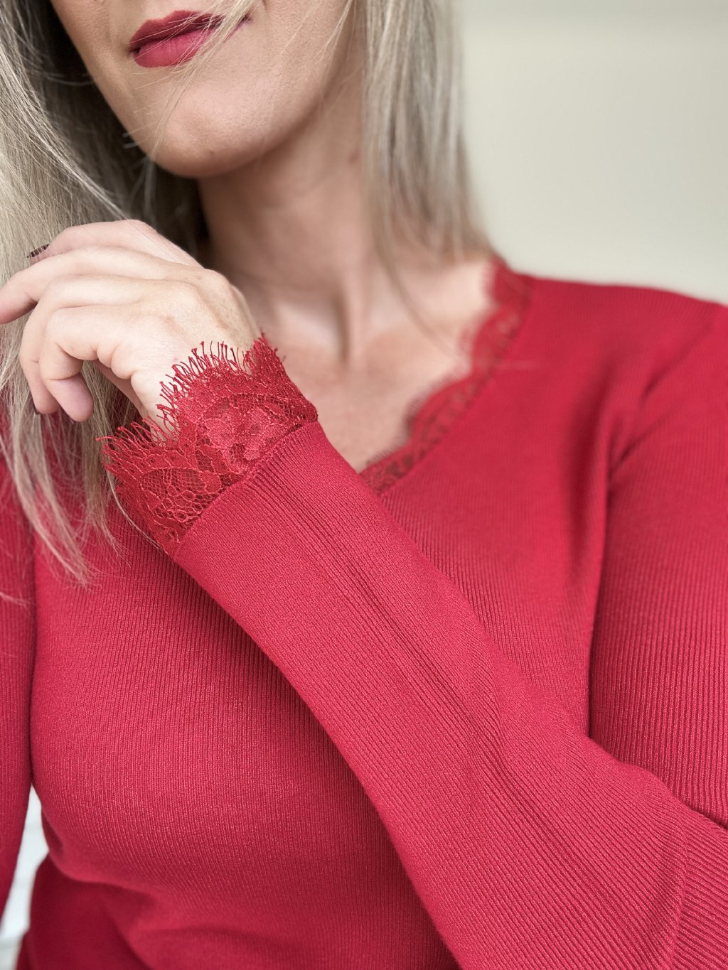 Červený rebrovaný top s dlhými rukávmi a čipkovaným výstrihom do V. Spája v sebe eleganciu vďaka čipke a ležérnosť vďaka rebrovanému materiálu, čo ho robí vhodným na rôzne príležitosti.