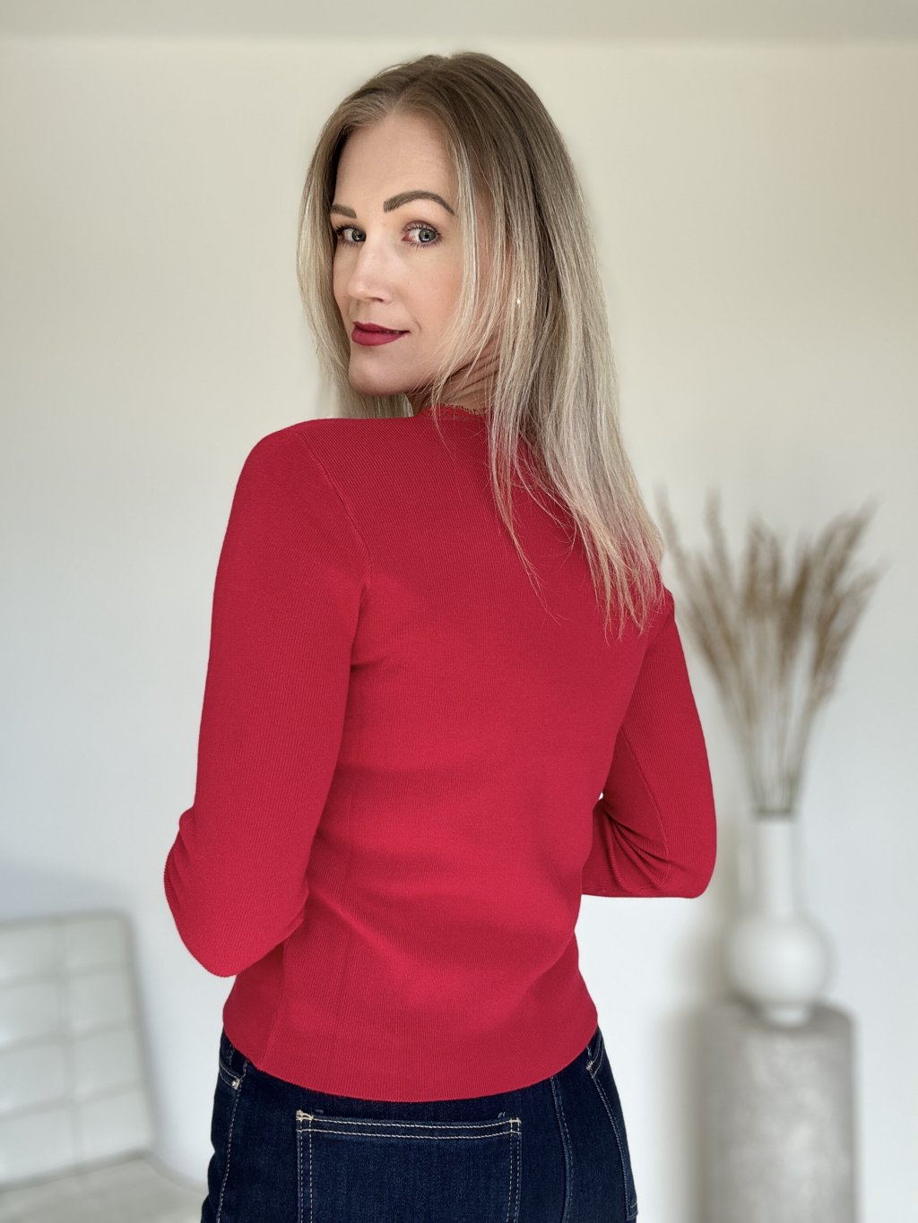 Červený rebrovaný top s dlhými rukávmi a čipkovaným výstrihom do V.