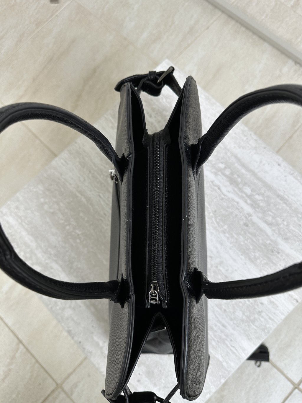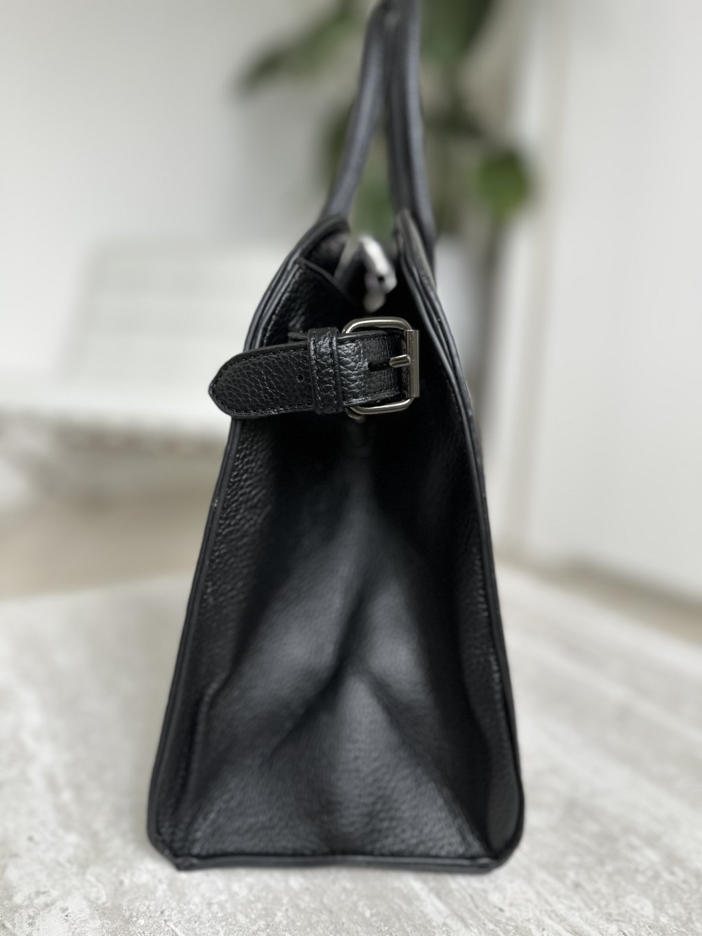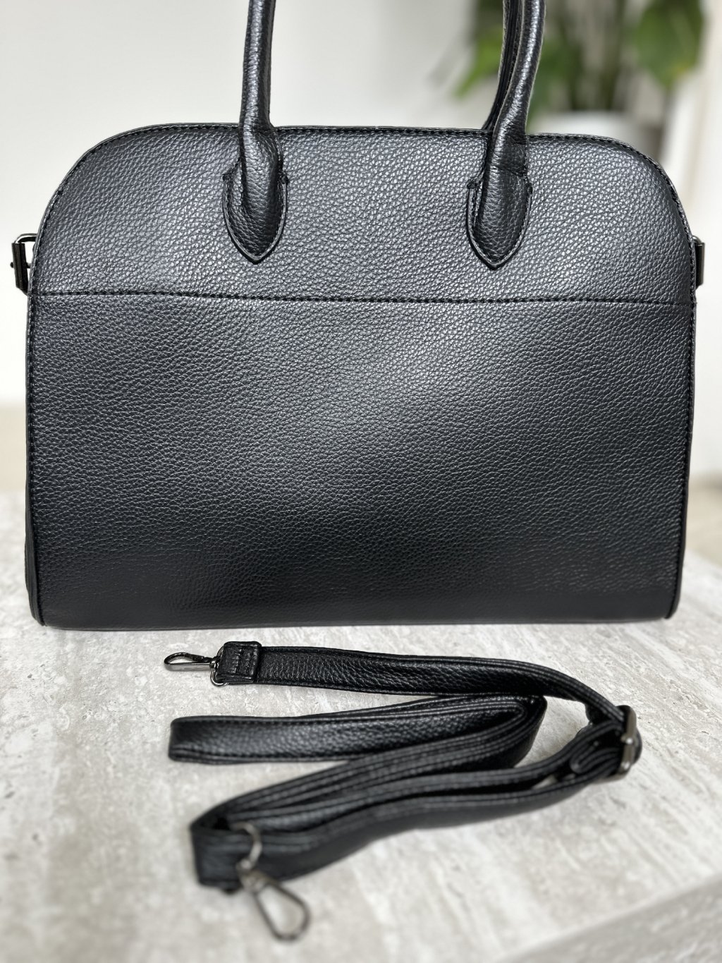 Klasická nadčasová koženková kabelka s minimalistickým dizajnom s jedným vodorovným švom. Kabelka má dve pevné rúčky na nosenie v ruke.