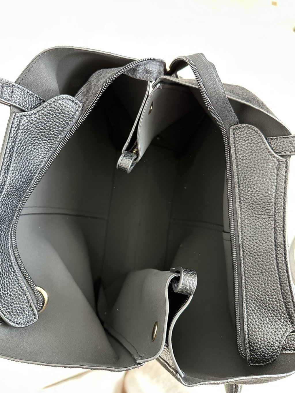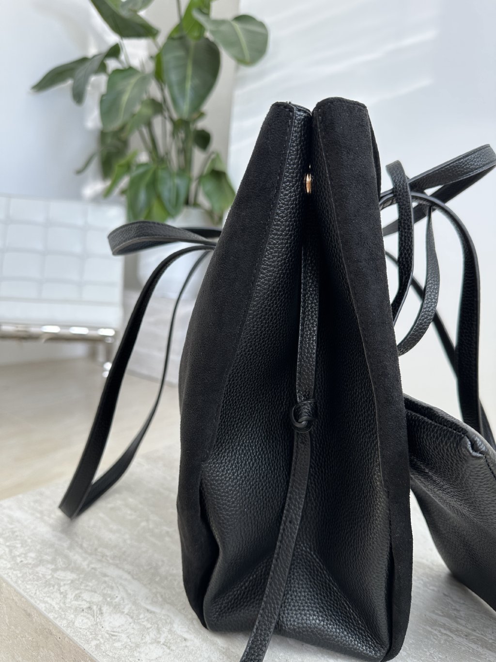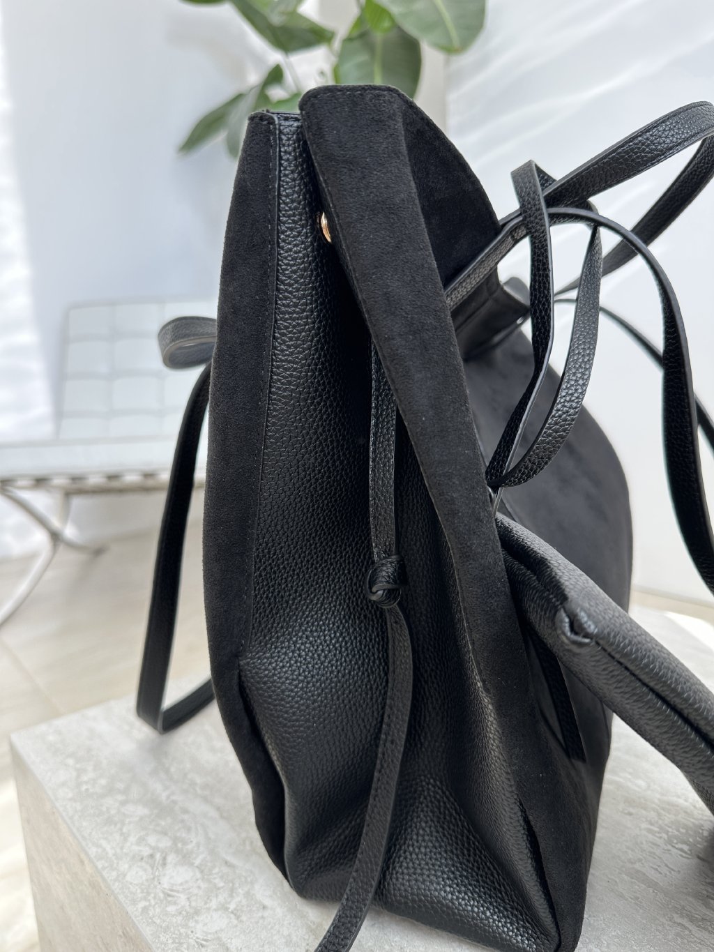 Čierna semišová shopper kabelka ktorá pôsobí nadčasovo a prakticky, vhodná pre rôzne príležitosti. Ide o shopper kabelku, ktorá je charakteristická svojím priestranným interiérom a otvoreným dizajnom, ideálna na každodenné nosenie alebo nákupy.