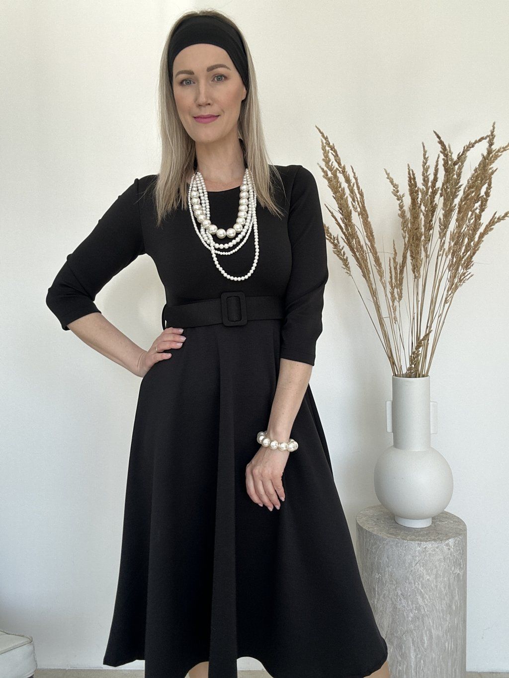 Elegantné čierne šaty sú navrhnuté v nadčasovom midi strihu, ktorý siaha pod kolená, čím pôsobí veľmi žensky a sofistikovane. Šatý su bez náhrdelníka