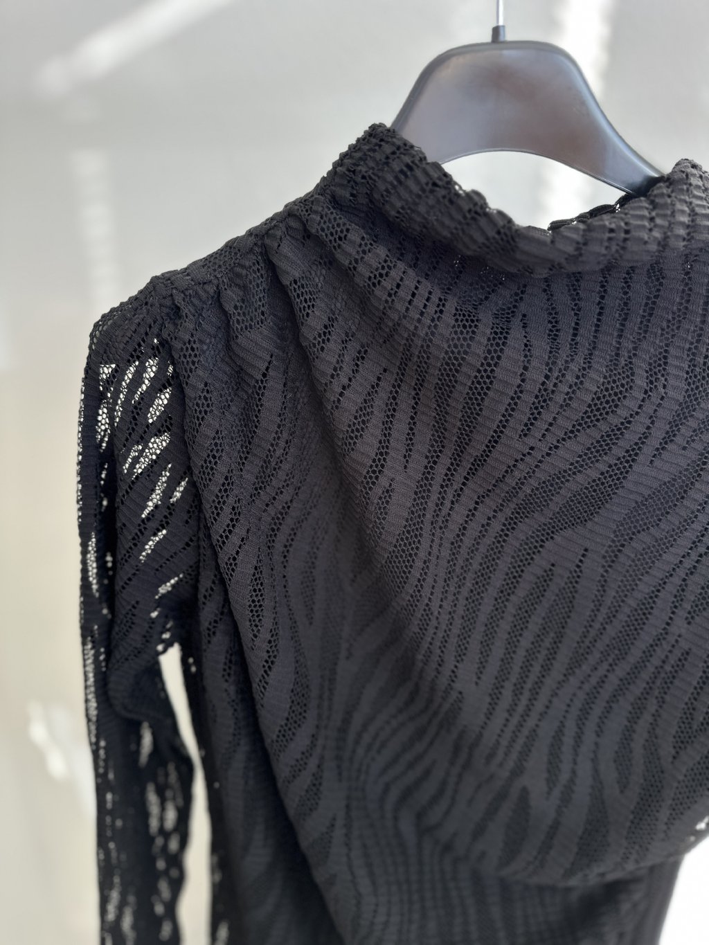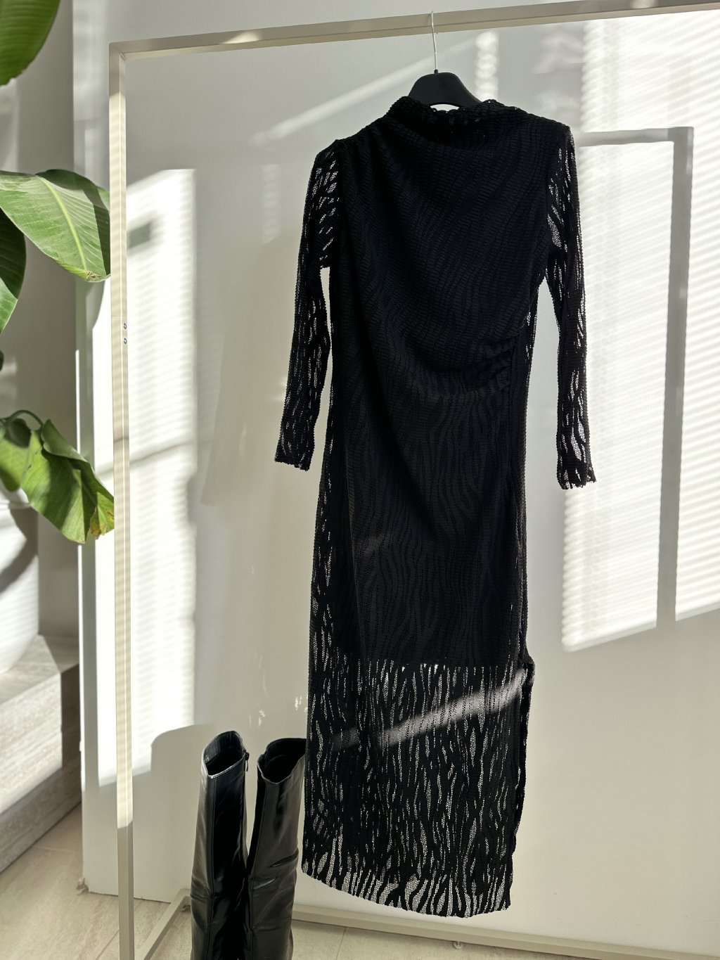 Čierne tylové midi šaty so zvieracím (zebra) vzorom a dlhými rukávmi. Sú vyrobené z elastického tylového alebo sieťovaného materiálu, ktorý je mierne priesvitný a rebrovaný.
