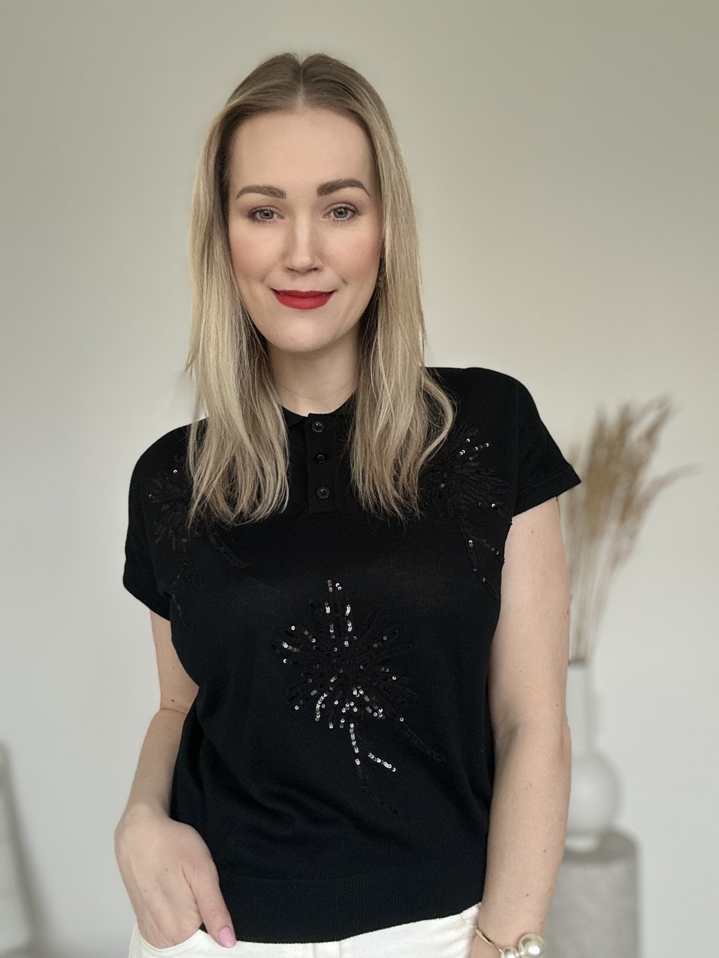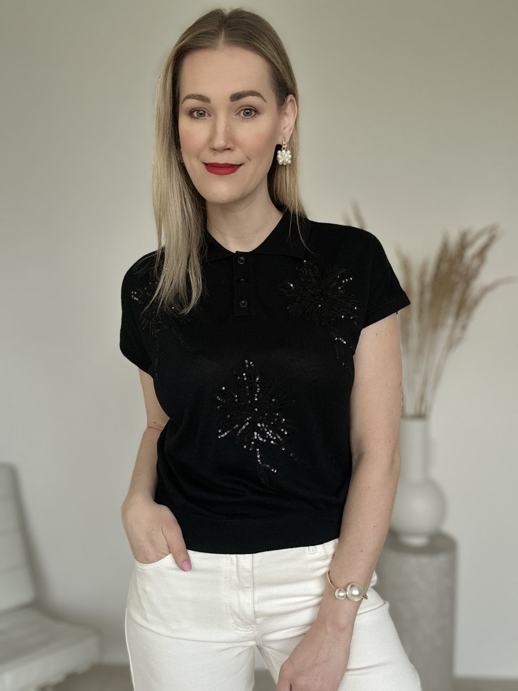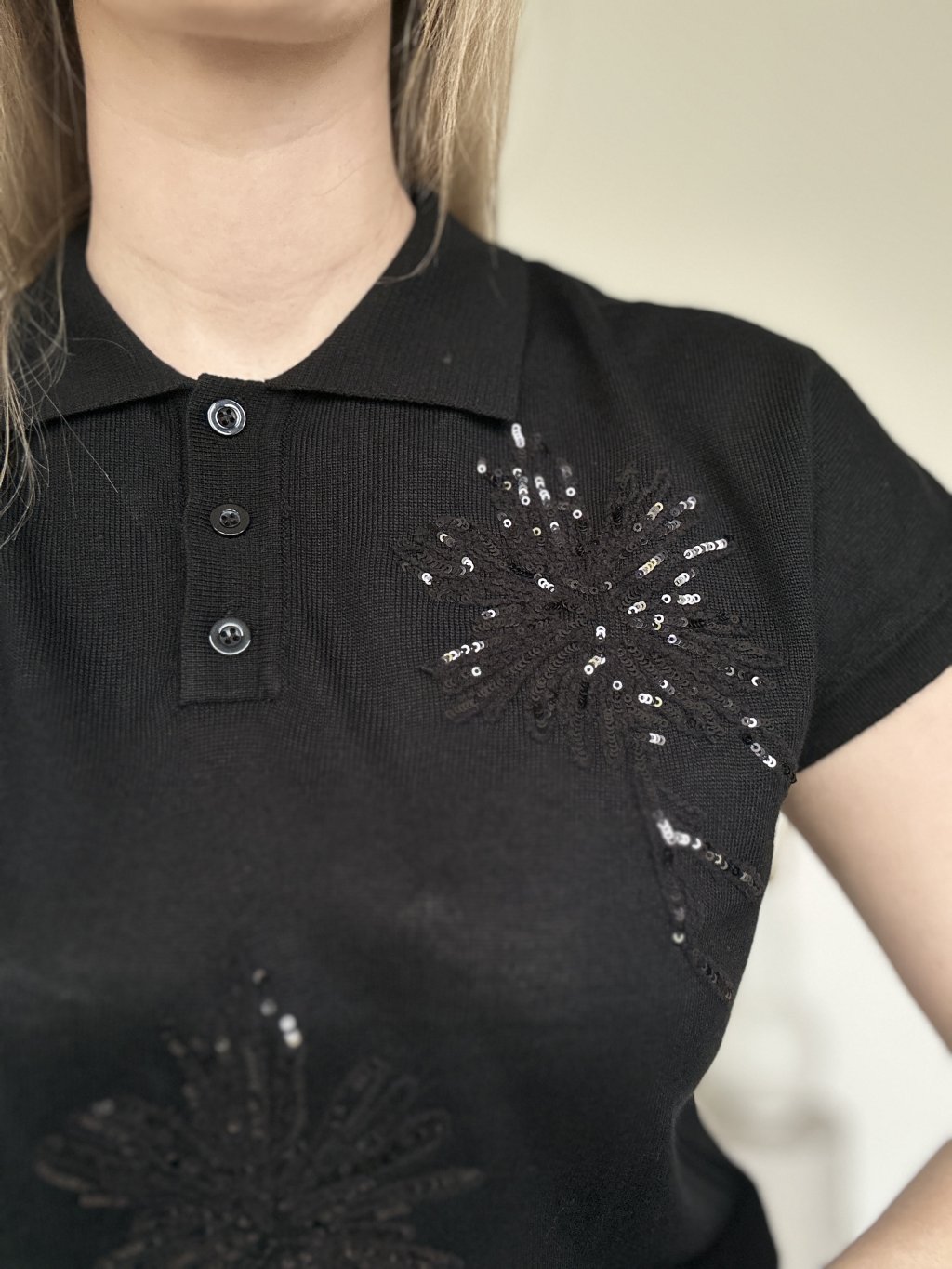 Elegantná dámska polokošeľa z jemného úpletu v čiernom odtieni. Tento kúsok spája športovú klasiku s dekoratívnymi prvkami. Dominantným prvkom je výrazná kvetinová výšivka na prednej strane a v oblasti ramien. Výšivka je doplnená o jemné priehľadné flitre, ktoré topu dodávajú decentný odlesk pri pohybe.