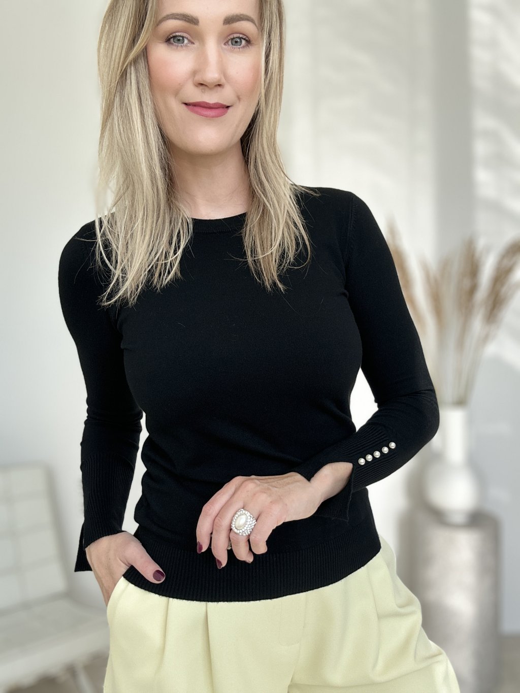 Jemný tenký sveter /top/ s ozdobnými perličkami na rukávoch. Perli nie sú súčasťou.