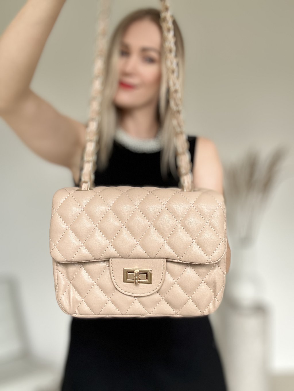 Prešívaná koženková crosbody kabelka cez rameno s reťazovým popruhom prepletený koženkovým materiálom. Elegantná a vhodná na spoločenské udalosti alebo ako doplnok k dennému outfitu.