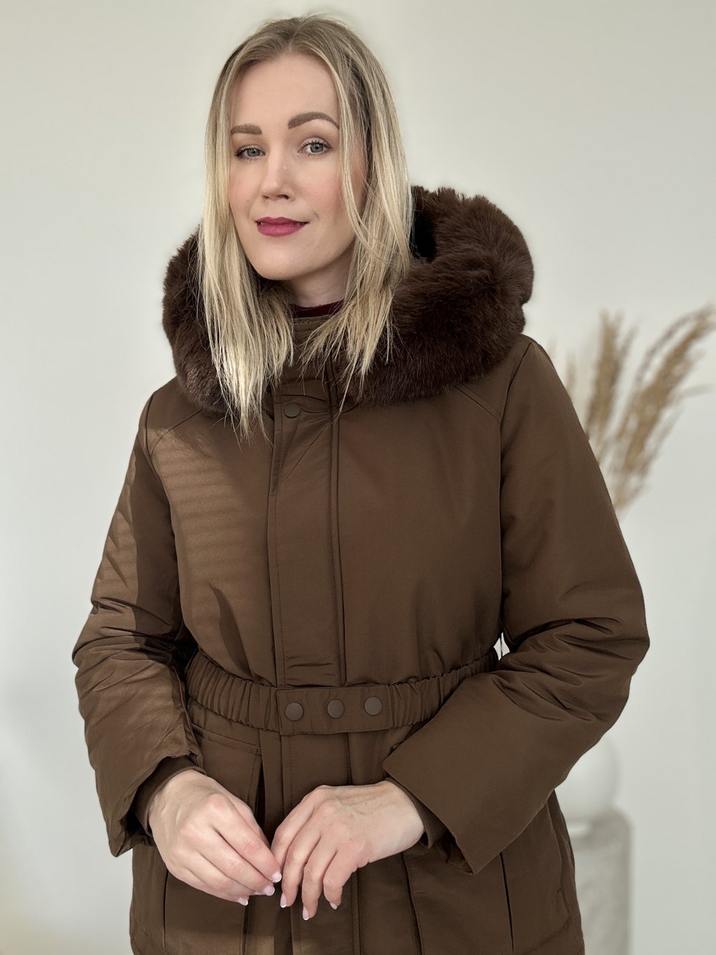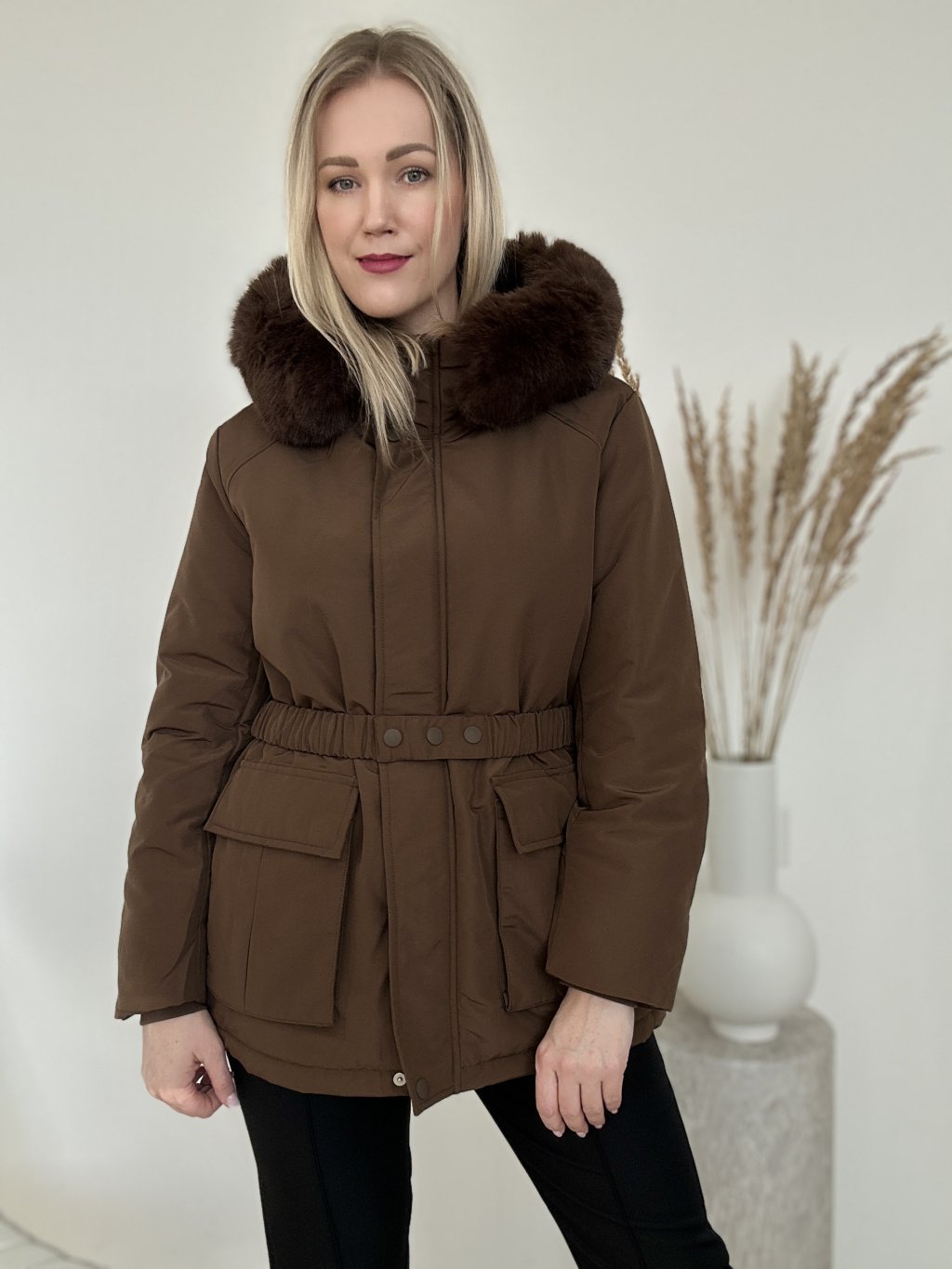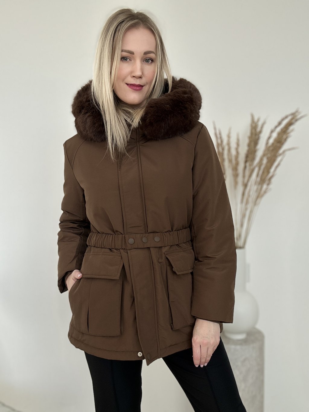 Hnedá zimná bunda/parka/ s kapucňou a kožušinovým lemom, opaskom v páse a priestrannými vreckami. Nepremokavá, zapínanie na zips a aj na cvoky ideálna do chladného počasia.