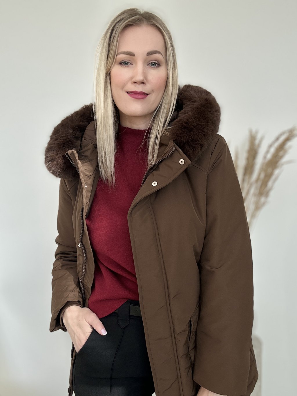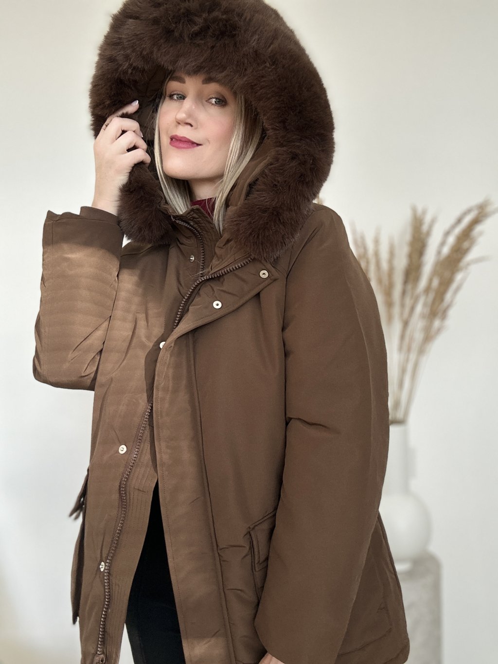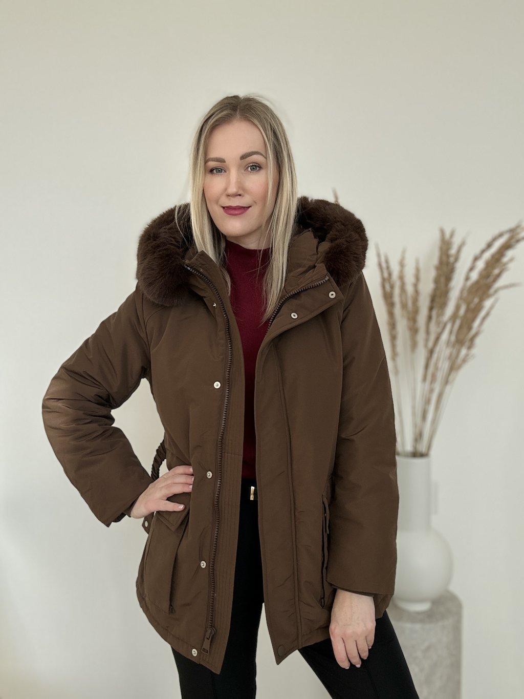Hnedá zimná bunda/parka/ s kapucňou a kožušinovým lemom, opaskom v páse a priestrannými vreckami. Nepremokavá, zapínanie na zips a aj na cvoky ideálna do chladného počasia.