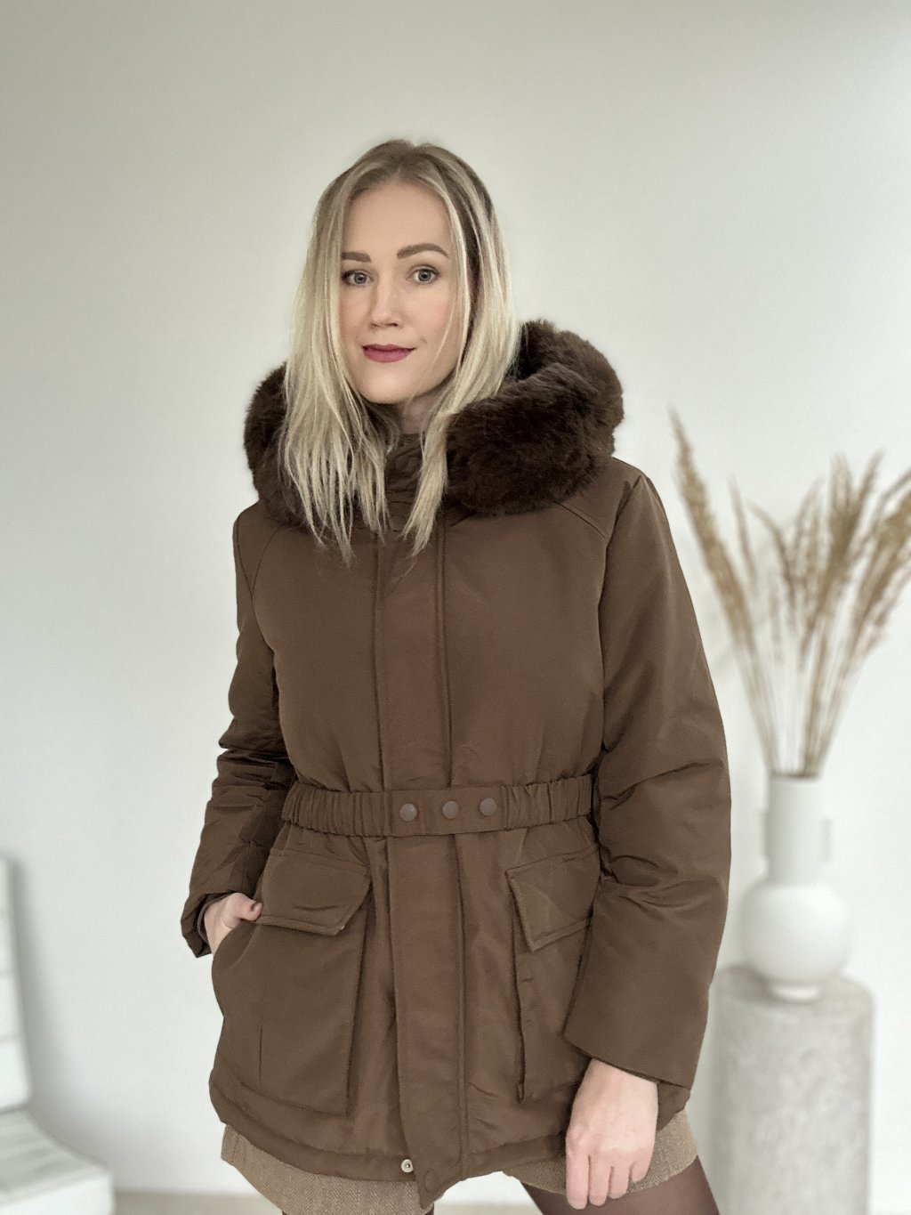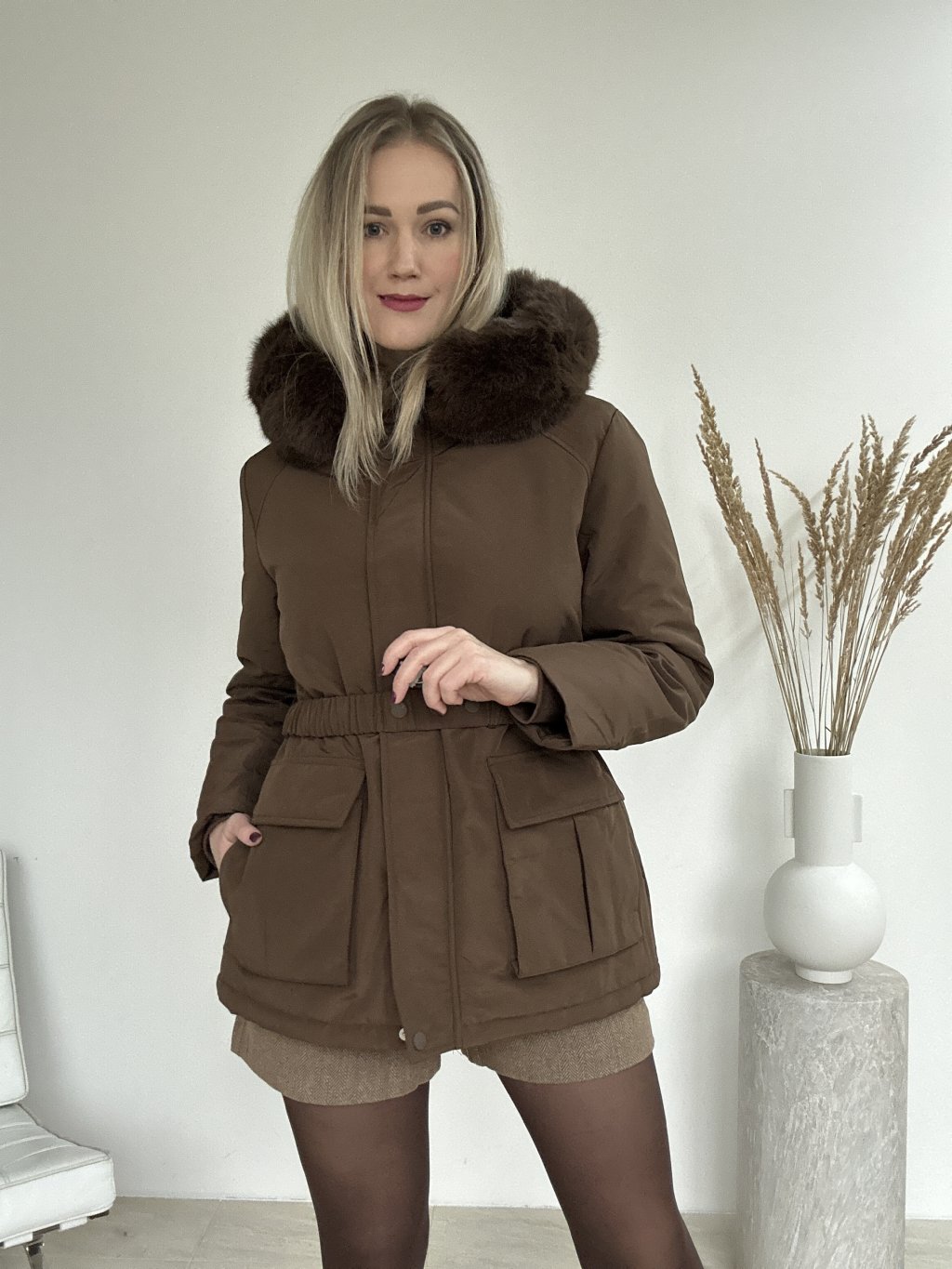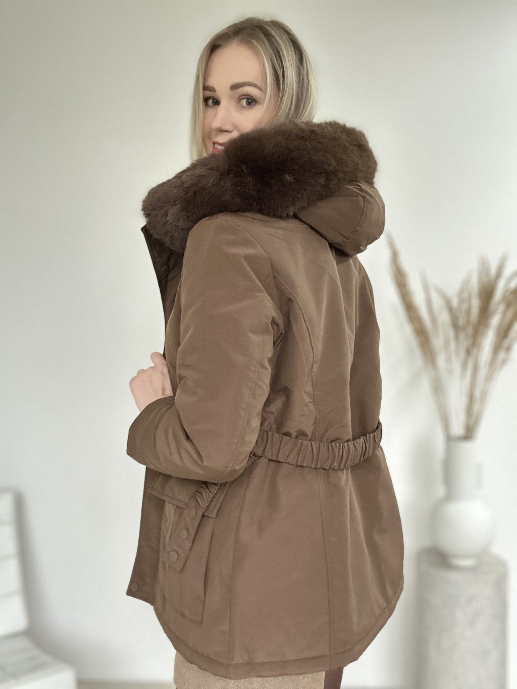 Hnedá zimná bunda/parka/ s kapucňou a kožušinovým lemom, opaskom v páse a priestrannými vreckami. Nepremokavá, zapínanie na zips a aj na cvoky ideálna do chladného počasia.