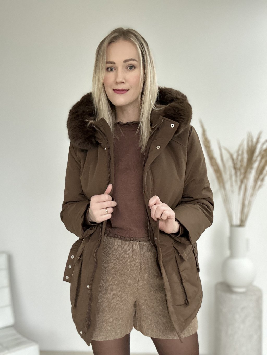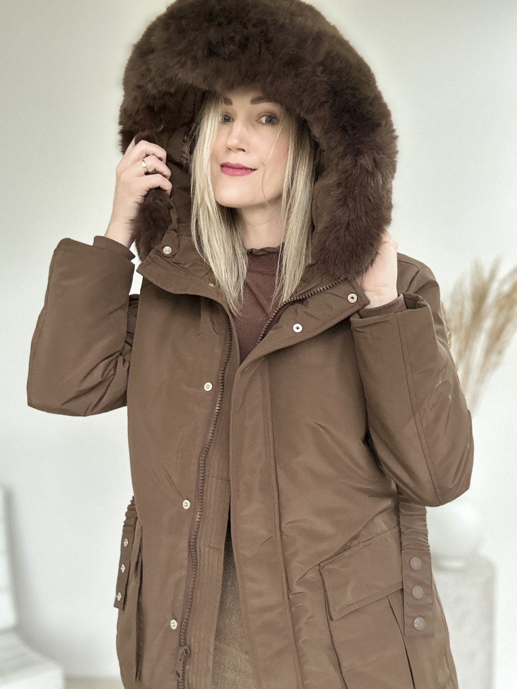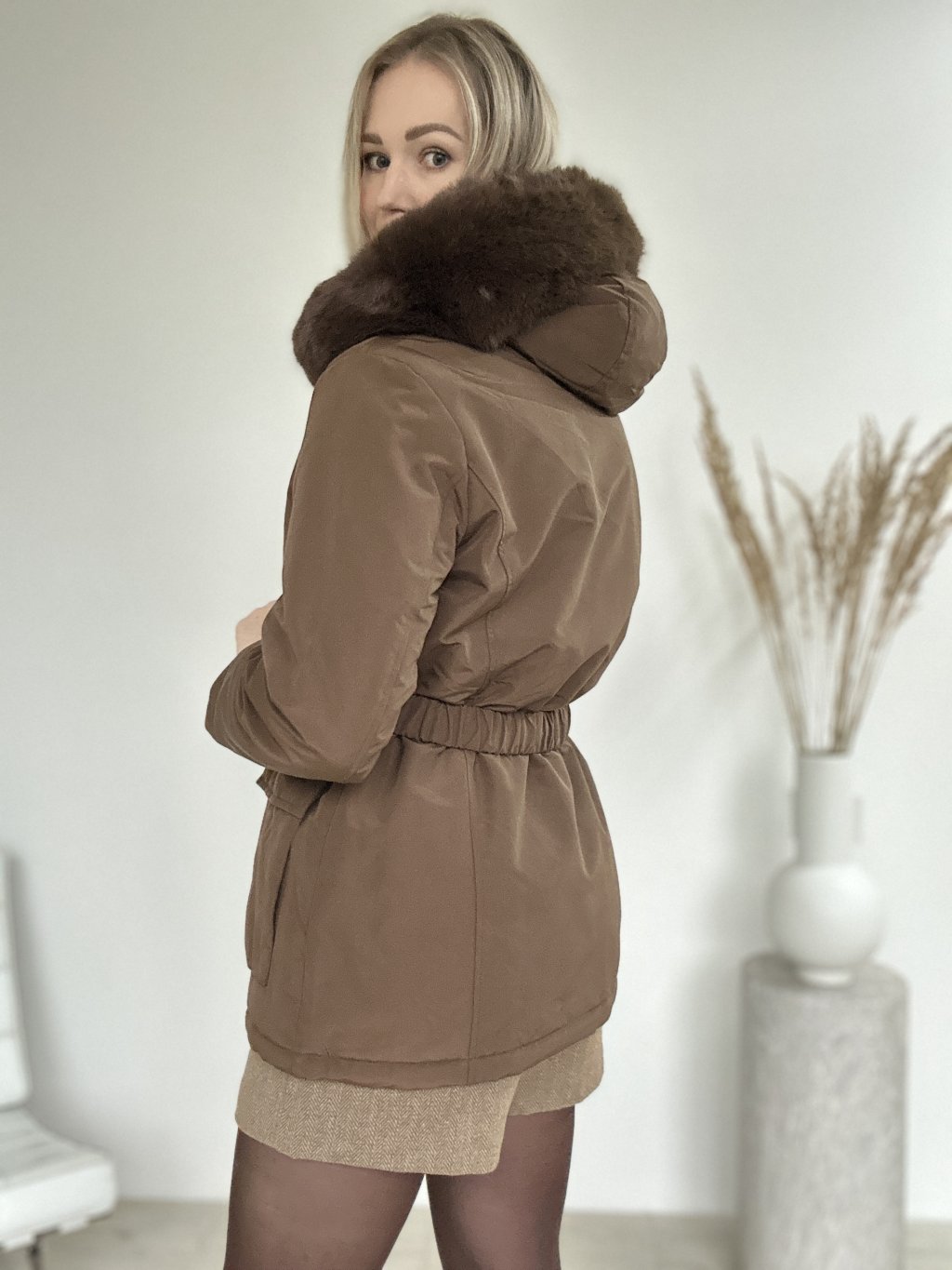 Hnedá zimná bunda/parka/ s kapucňou a kožušinovým lemom, opaskom v páse a priestrannými vreckami. Nepremokavá, zapínanie na zips a aj na cvoky ideálna do chladného počasia.