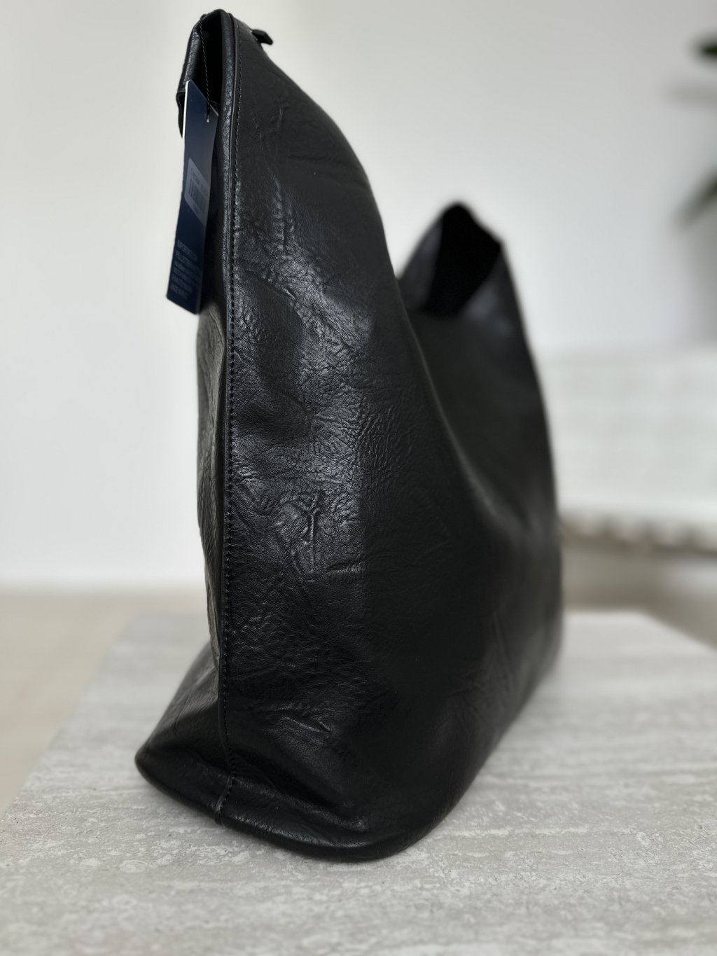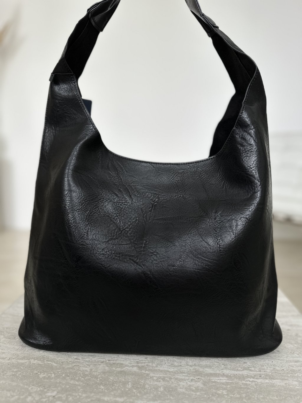 Čierna taška cez rameno je štýlový a praktický hobo alebo shoper model. Materiál je z kvalitnej imitácie kože a dizajn s jedným širokým uchom na nosenie cez rameno. Súčasťou je aj malá cross body kabelka i identickej farbe.