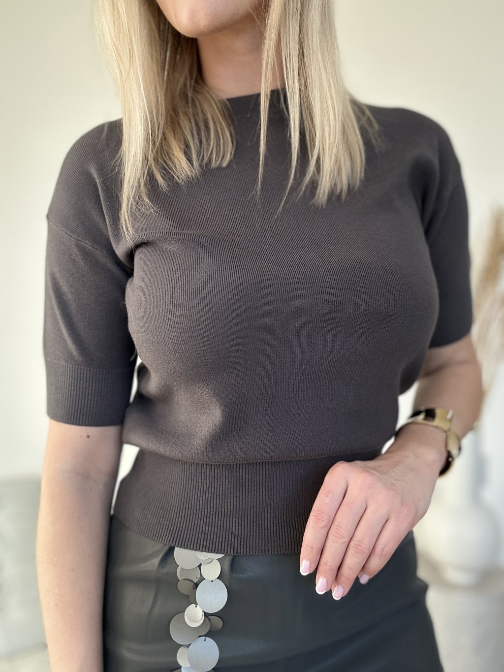 Dvojdielna súprava sa skladá z úpletového topu a z koženkovej sukne. Úpletový top s krátkym rukávom elastický. Koženková sukňa je s rázporkom a má gumičku v páse.