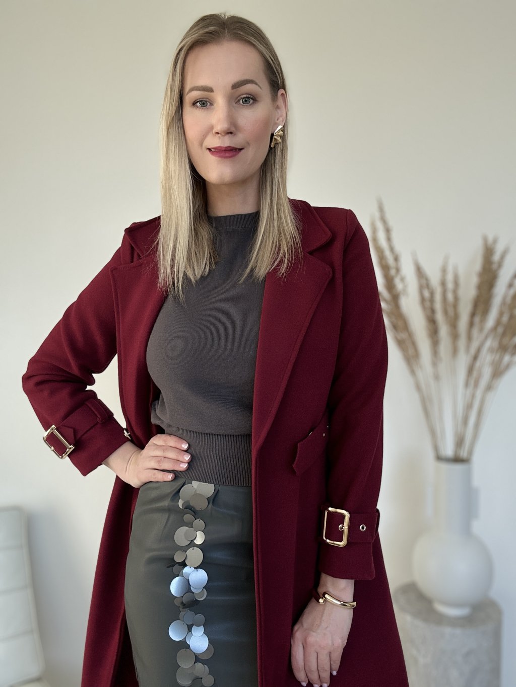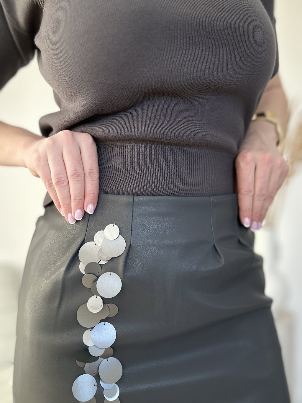 Dvojdielna súprava sa skladá z úpletového topu a z koženkovej sukne.