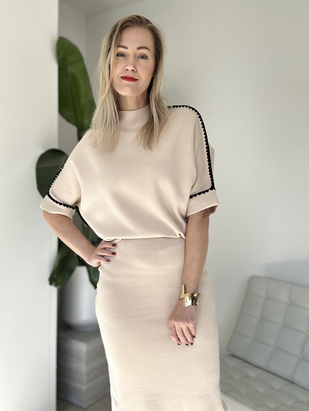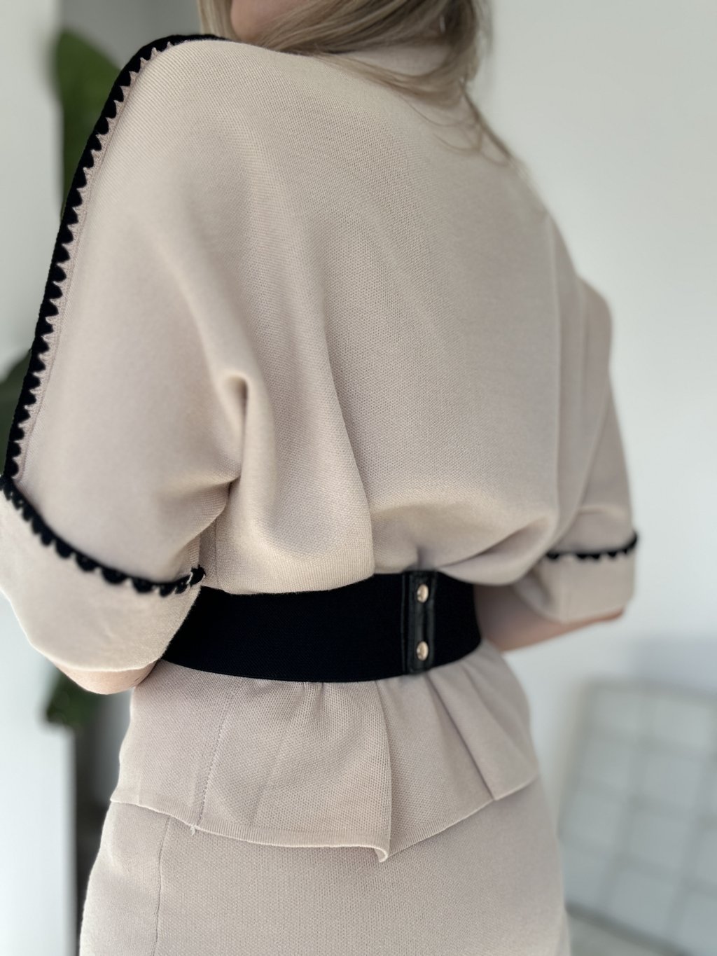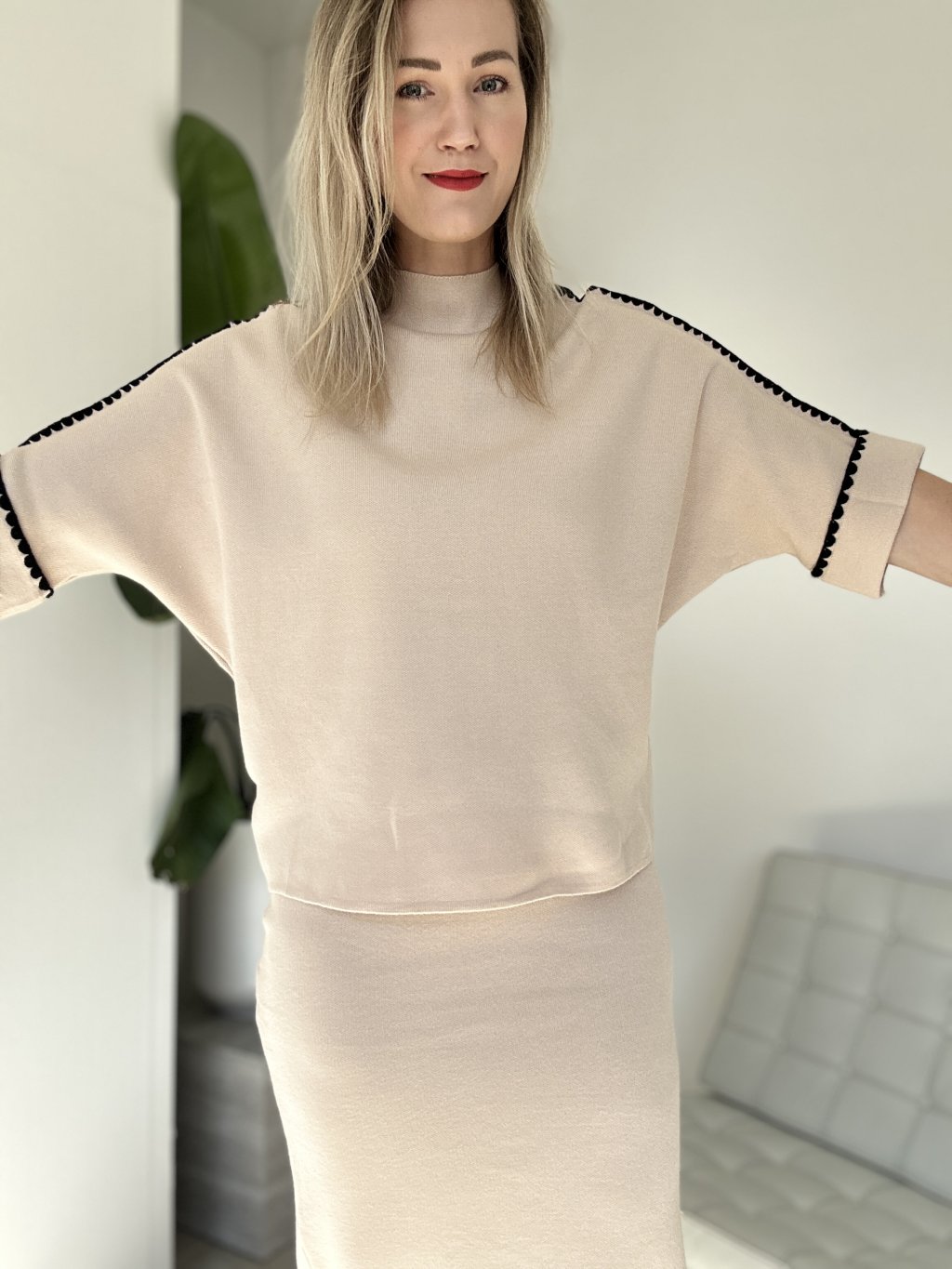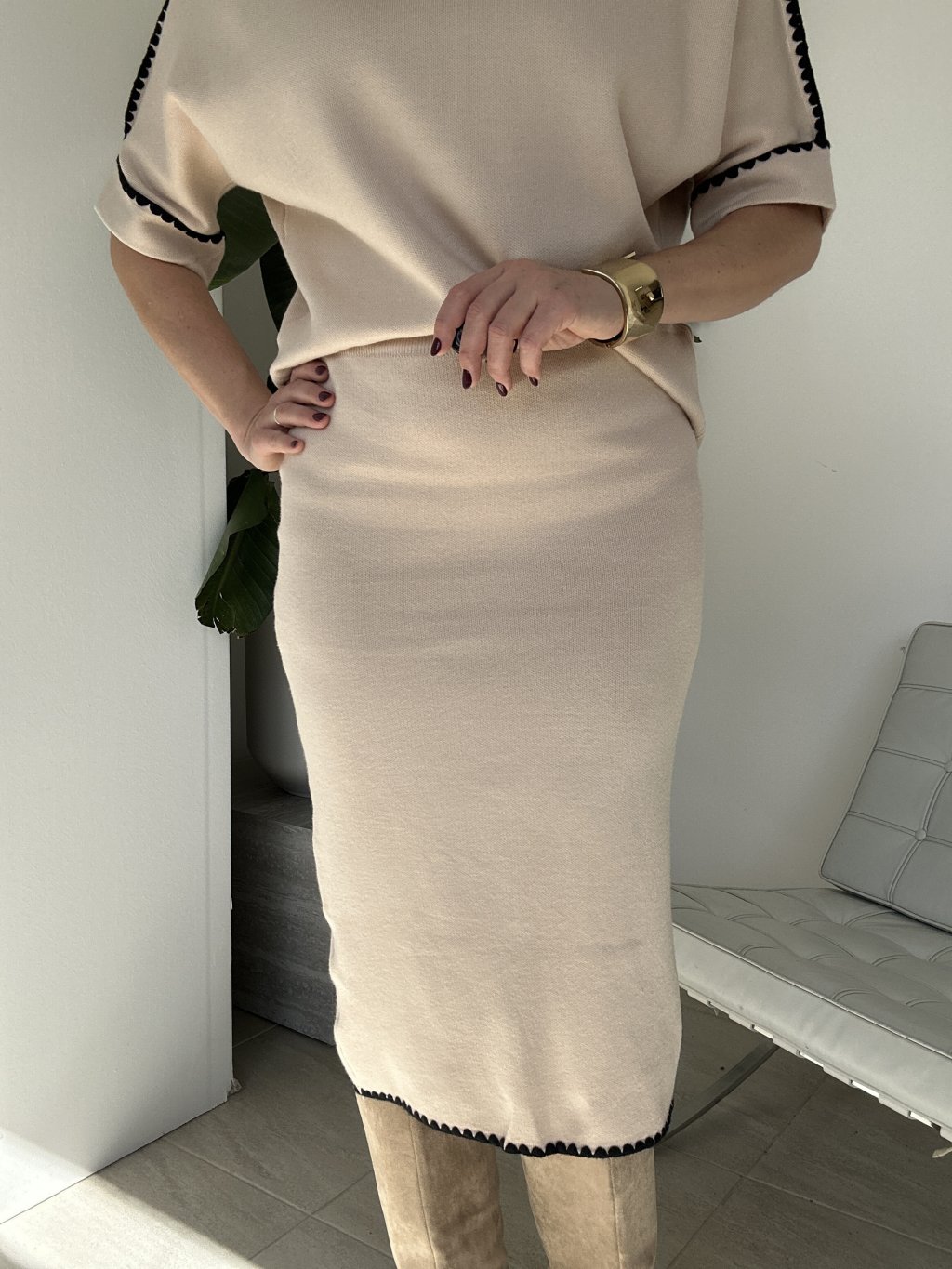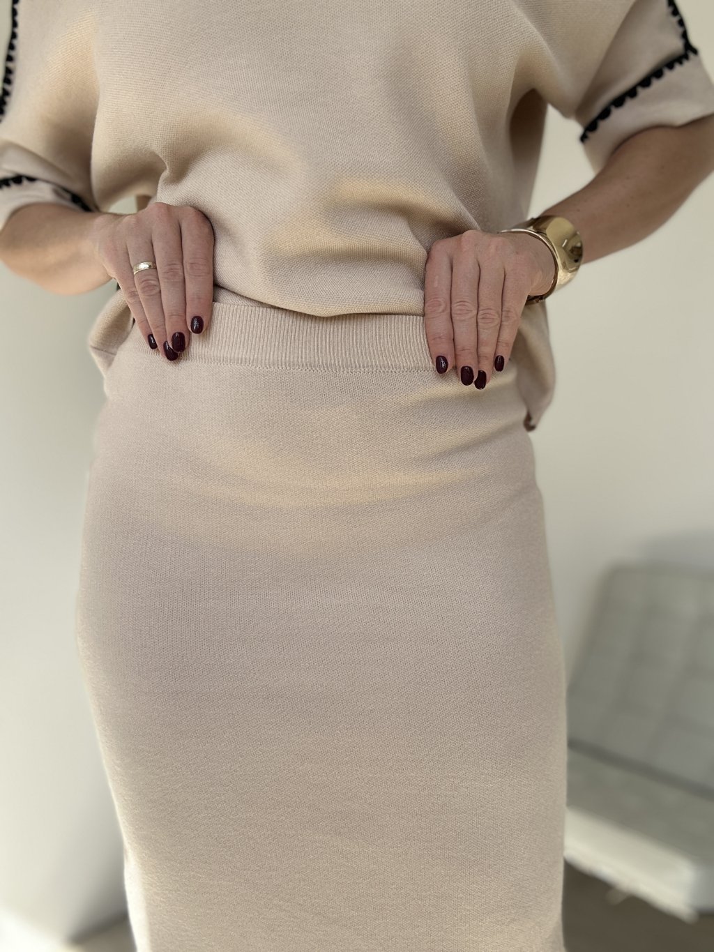Dvojdielny úpletový sukňový komplet s bielymi detailmi na lemoch.