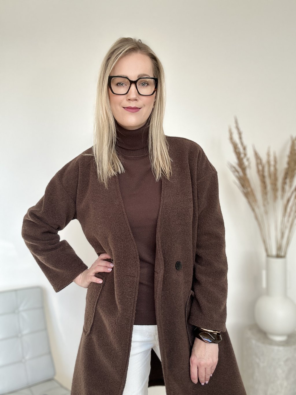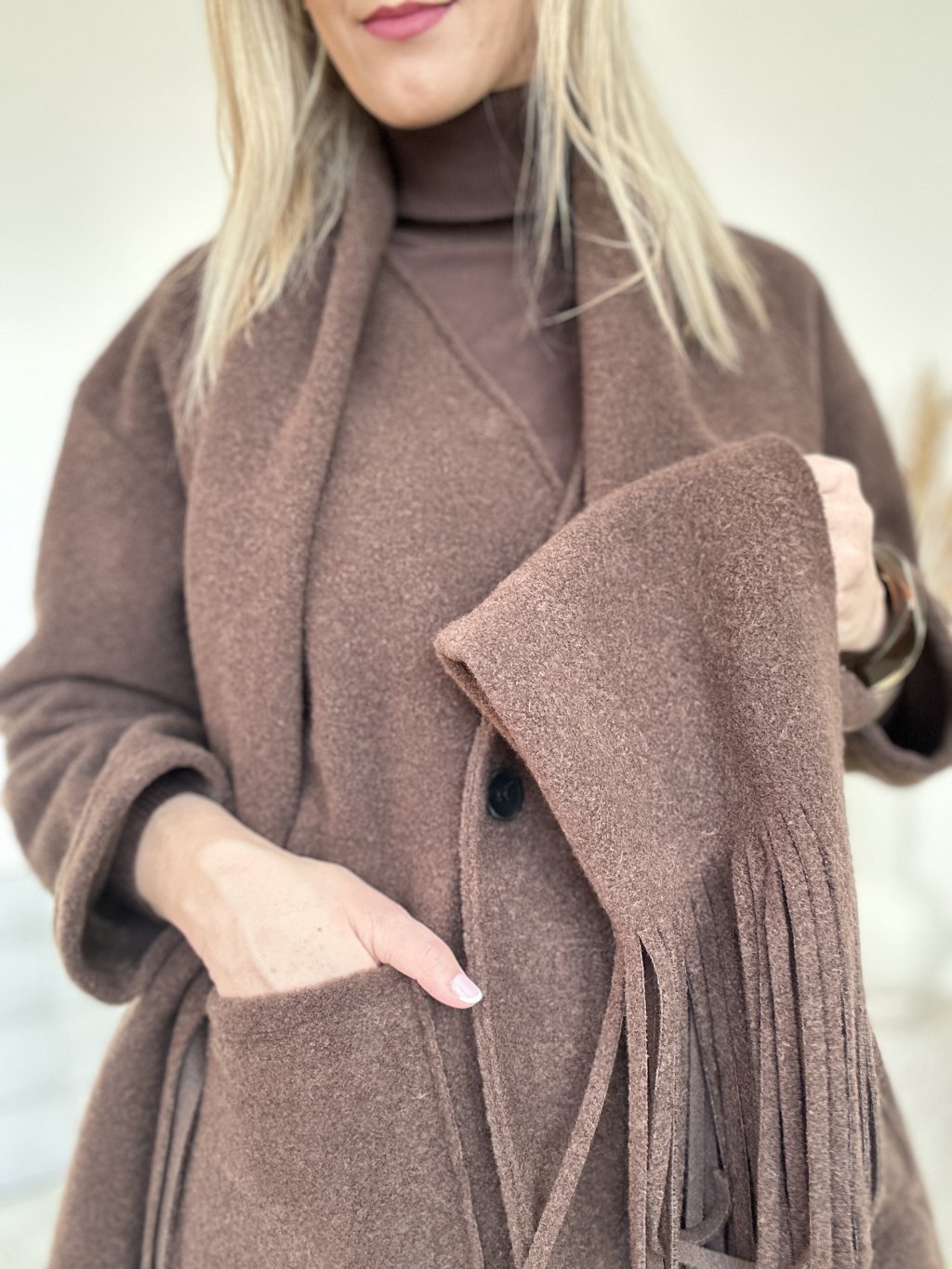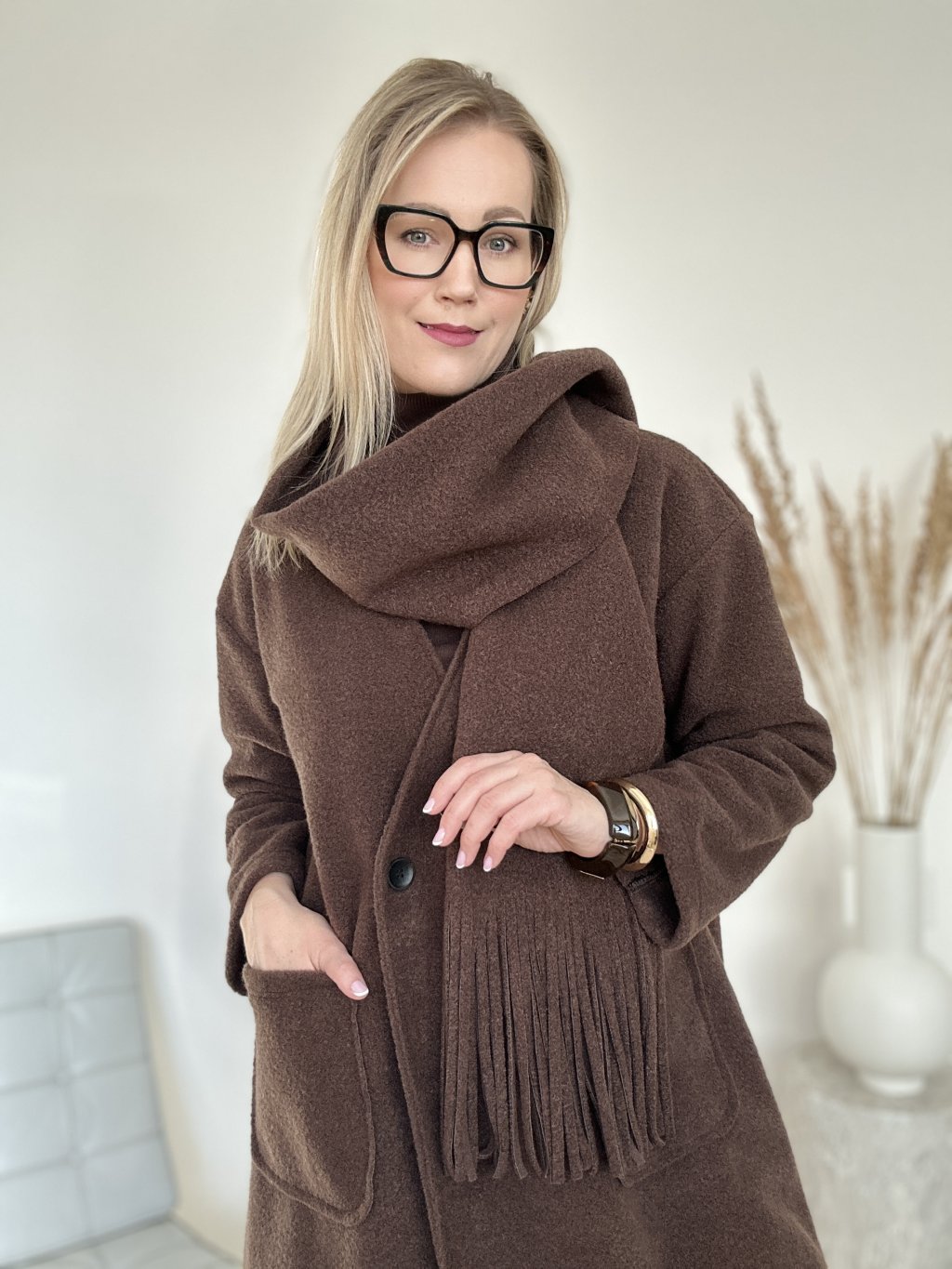 Dlhý dvojradový kabát bez goliera s širokým strapcovým šálom.