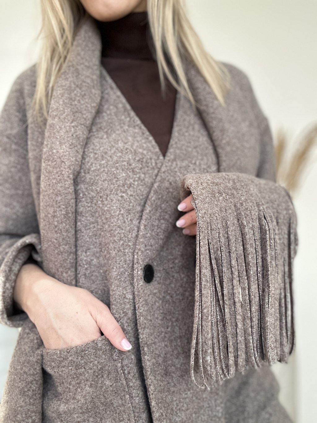 Dlhý dvojradový kabát bez goliera s širokým strapcovým šálom. Kabát je nepodšitý ale s funkčnými vreckami.