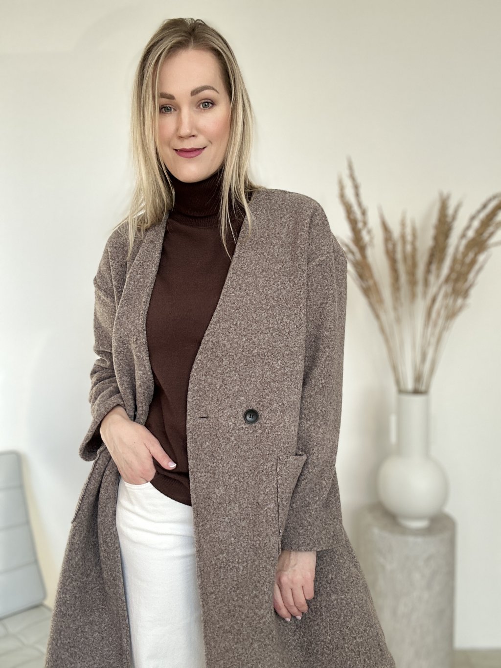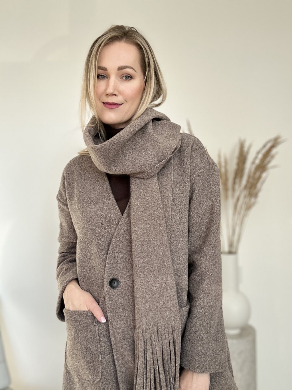 Dlhý dvojradový kabát bez goliera s širokým strapcovým šálom.