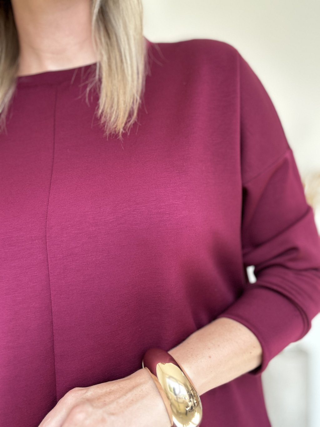 Sýta bordová (vínová) mikina, ktorá pôsobí elegantne a je ľahko kombinovateľná.