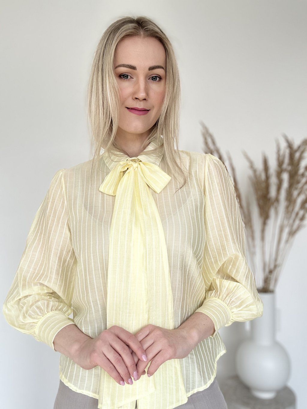 Žltá blúzka s vertikálnymi pruhmi a výrazným viazaním pri krku. Ide o štýlový kúsok, ktorý sa vyznačuje jemne transparentným materiálom a elegantným viazaním, ktoré dodáva outfitu sofistikovaný vzhľad.