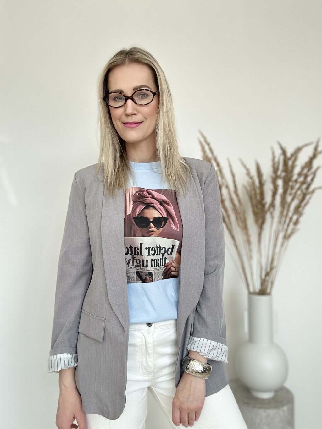 Elegantné štýlové sako bez zapínania a perfektne kombinovateľné.