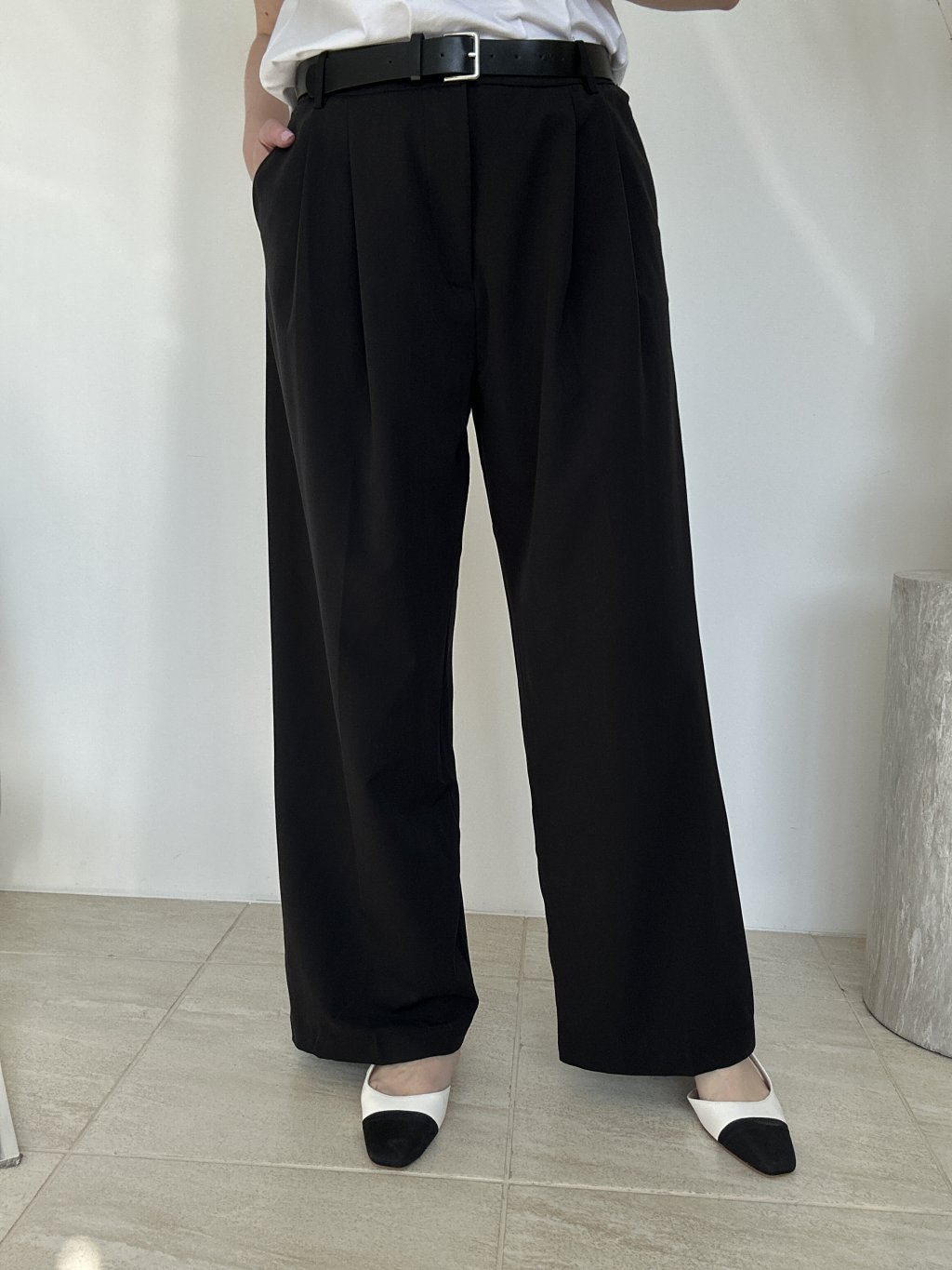 • Detaily v páse: Pás je doplnený pútkami, cez ktoré je prevlečený kontrastný čierny opasok s kovovou prackou. Pod pásom sa nachádzajú výrazné záhyby (puky), ktoré dodávajú nohaviciam objem a elegantný „tailored“ vzhľad.
