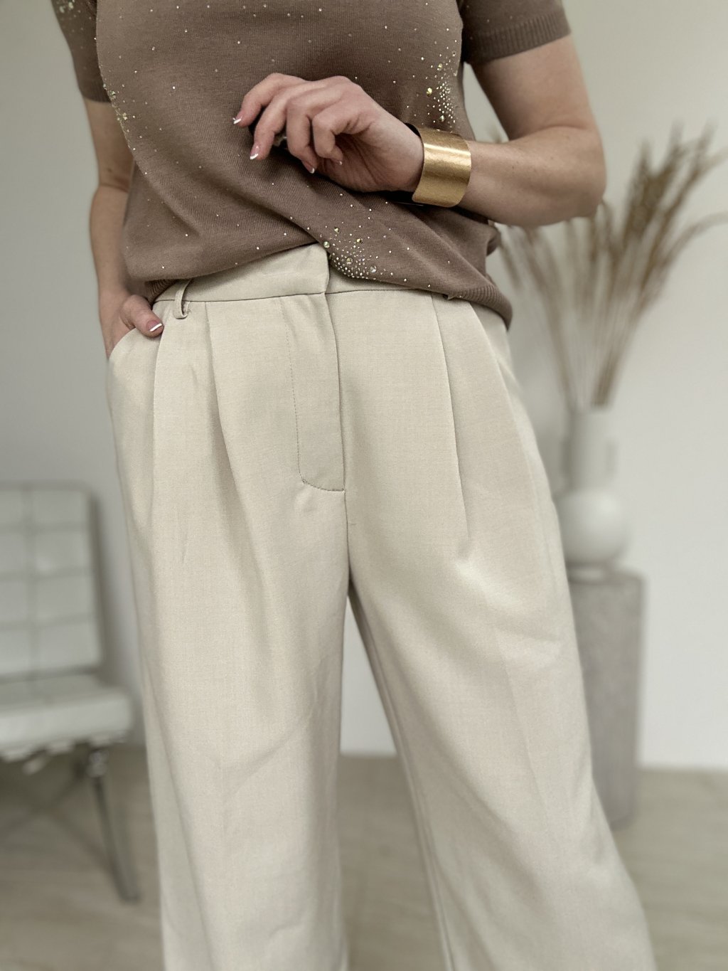 Dámske elegantné široké nohavice v béžovej alebo krémovej farbe, ktoré sa vyznačujú vysokým pásom a prednými záhybmi.  Tento štýl je často označovaný ako „wide leg“ alebo „palazzo“ nohavice a je obľúbený pre svoj elegantný, no zároveň pohodlný strih.