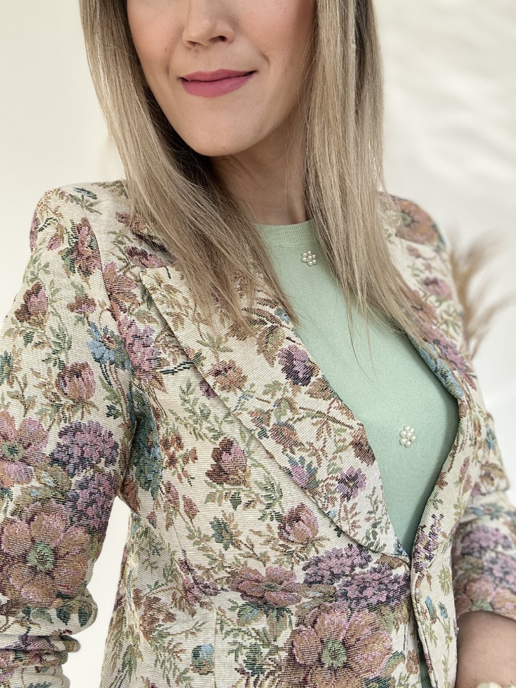 • Farebné detaily: Kontrast dopĺňajú listy v šalviovo-zelenej a petrolejovej farbe, čo dodáva saku vintage nádych.