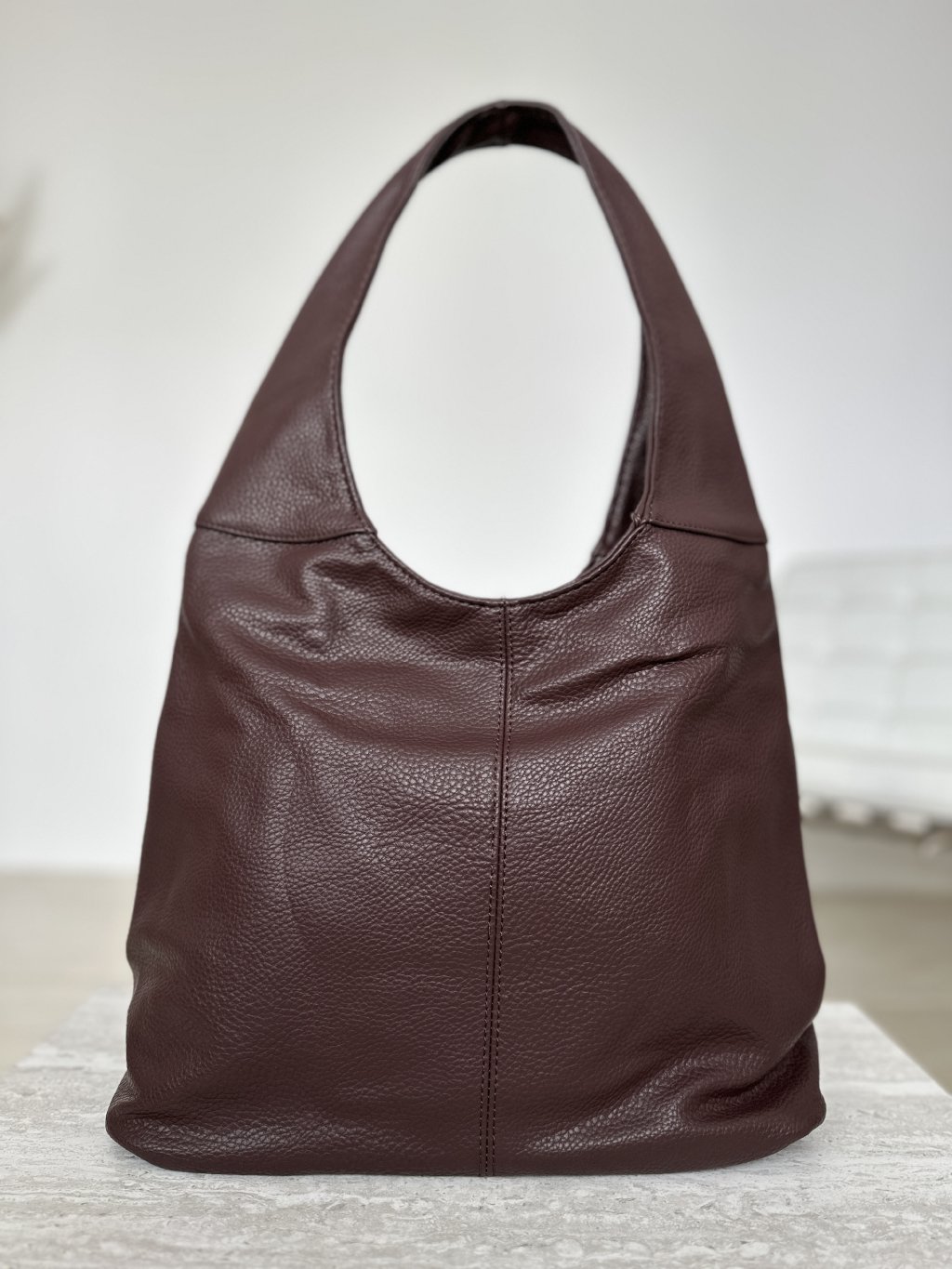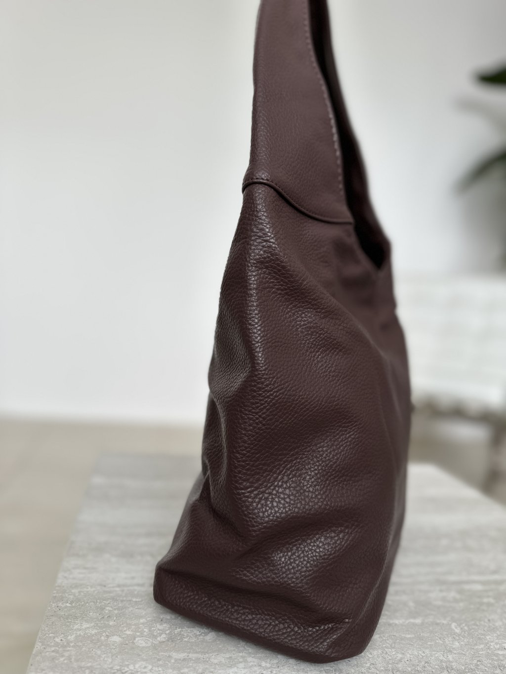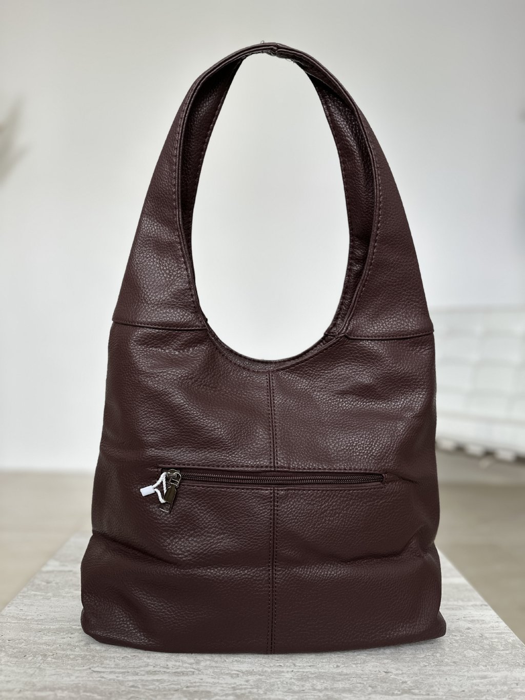 Hnedá koženková taška /kabelka / v štýle HOBO je vyrobená z umelej kože s mäkkou, zrnitou textúrou, má zakrivenú siluetu a jednofarebný dizajn.