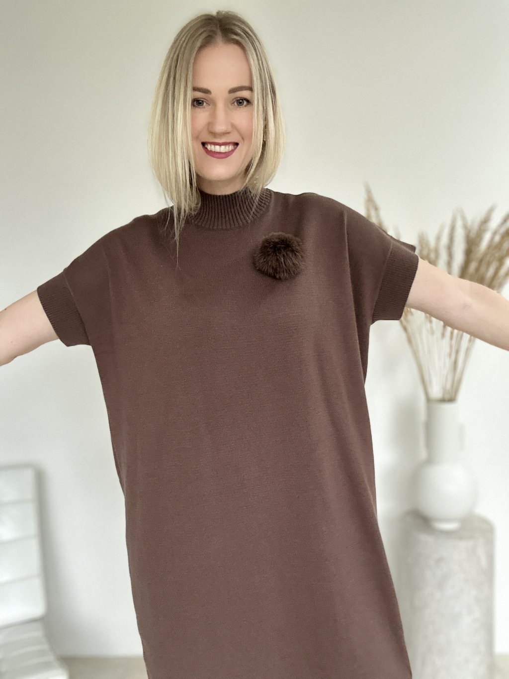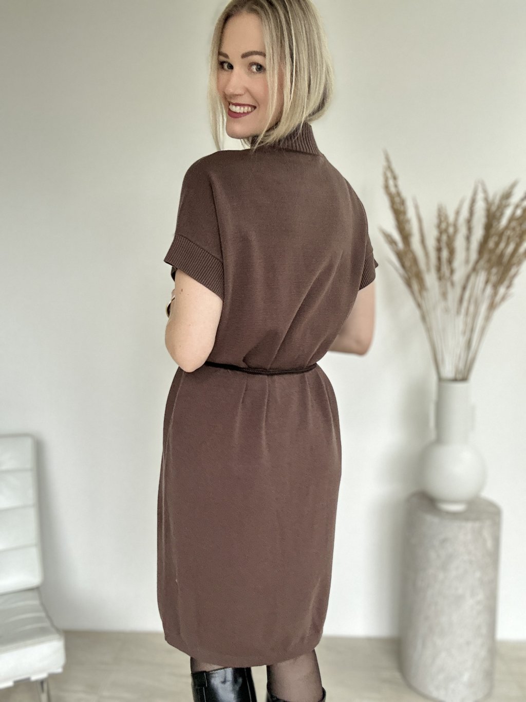 Pletené šaty s krátkym rukávom a stojačikovým golierom s brmbolcovou brošňou. Pletené šaty sú obľúbenou voľbou pre jesenné a zimné obdobie.