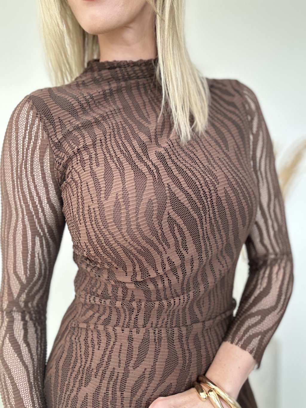 Hnedé tylové midi šaty so zvieracím (zebra) vzorom a dlhými rukávmi. Sú vyrobené z elastického tylového alebo sieťovaného materiálu, ktorý je mierne priesvitný a rebrovaný.