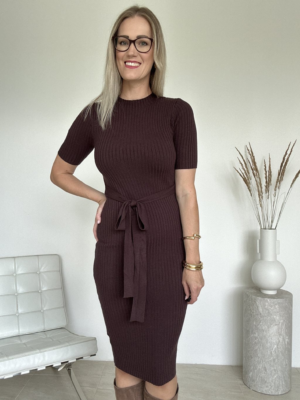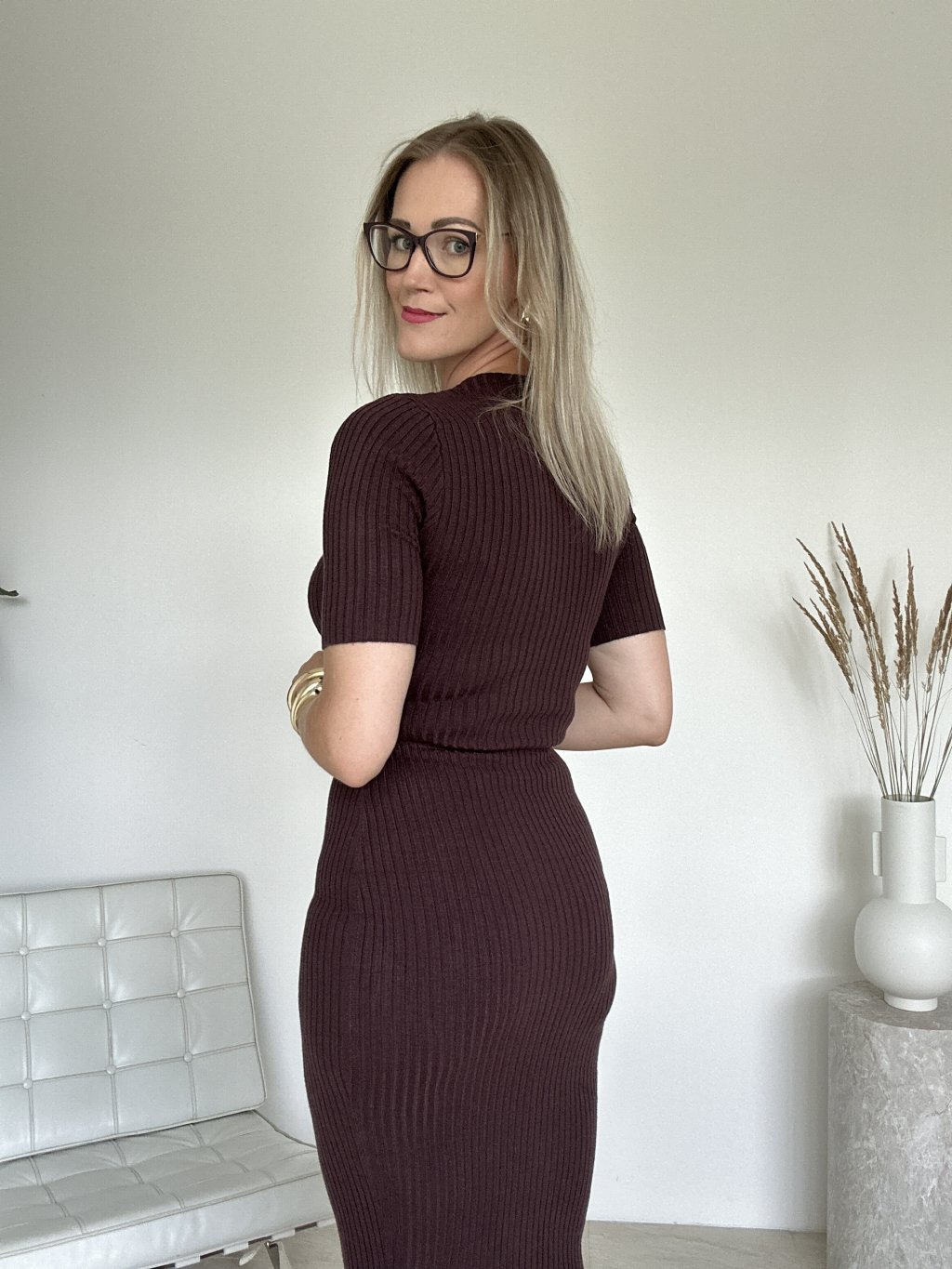 Jednoduché rebrované úpletové šaty s krátkym rukávom, priliehavým rovným strihom a súčasťou je aj opasok z rovnakého materiálu. Šaty pôsobia elegantne a minimalisticky vhodné sú na bežné nosenie a aj na formálnejšie príležitosti v závislosti od doplnkov.