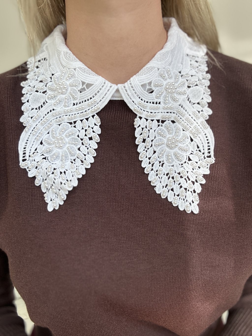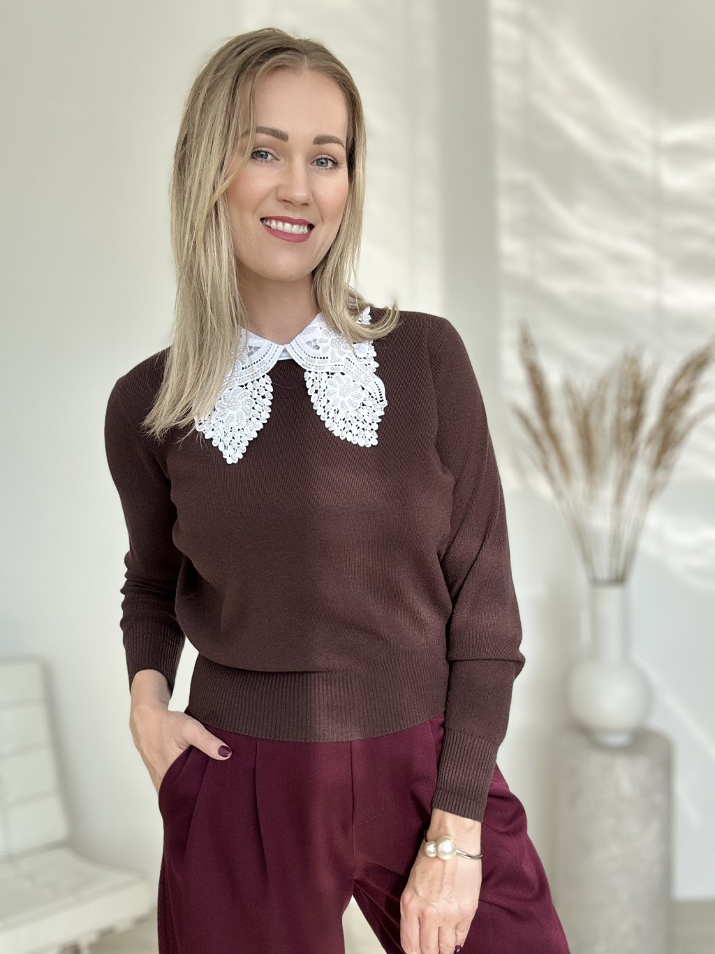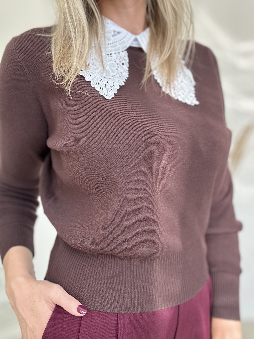 Hnedý pletený pulóver s bielym čipkovaným golierom. Klasický strih s výrazným dekoratívnym golierom, ktorý dodáva elegantný a ženský vzhľad.