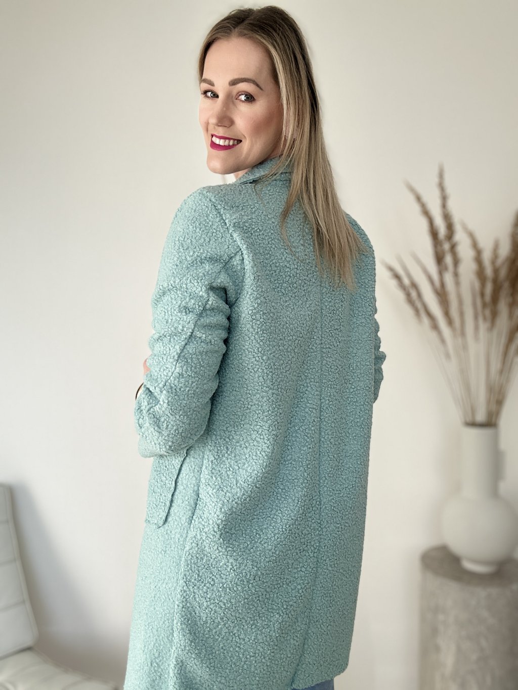 Uzlíčkový kabát klasického rovného strihu s vreckami a so zapínaním na gombíky.