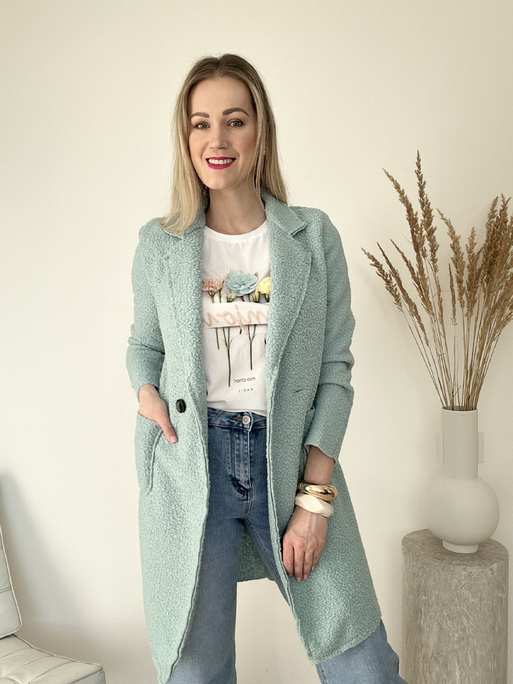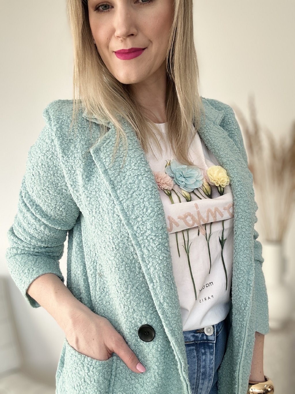 Jarný uzlíčkový kabát klasického rovného strihu s vreckami a so zapínaním na gombíky.